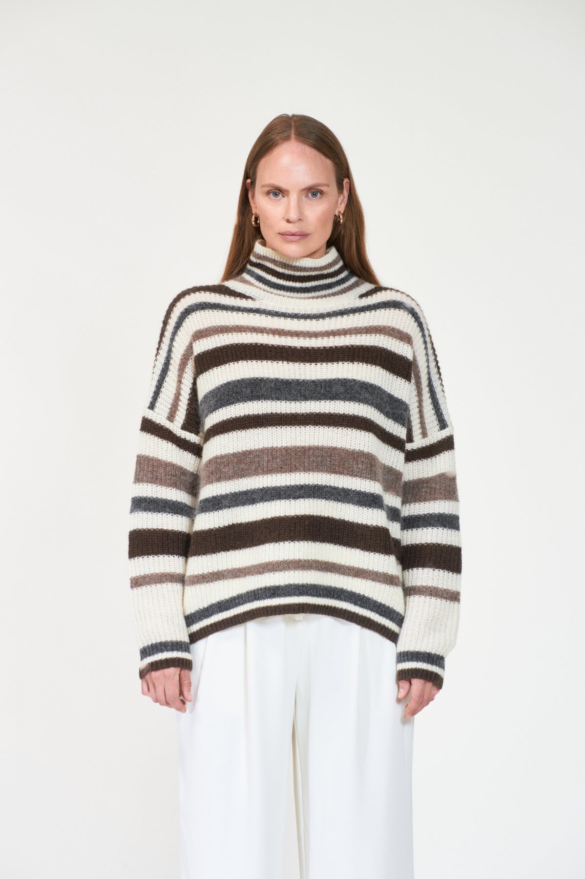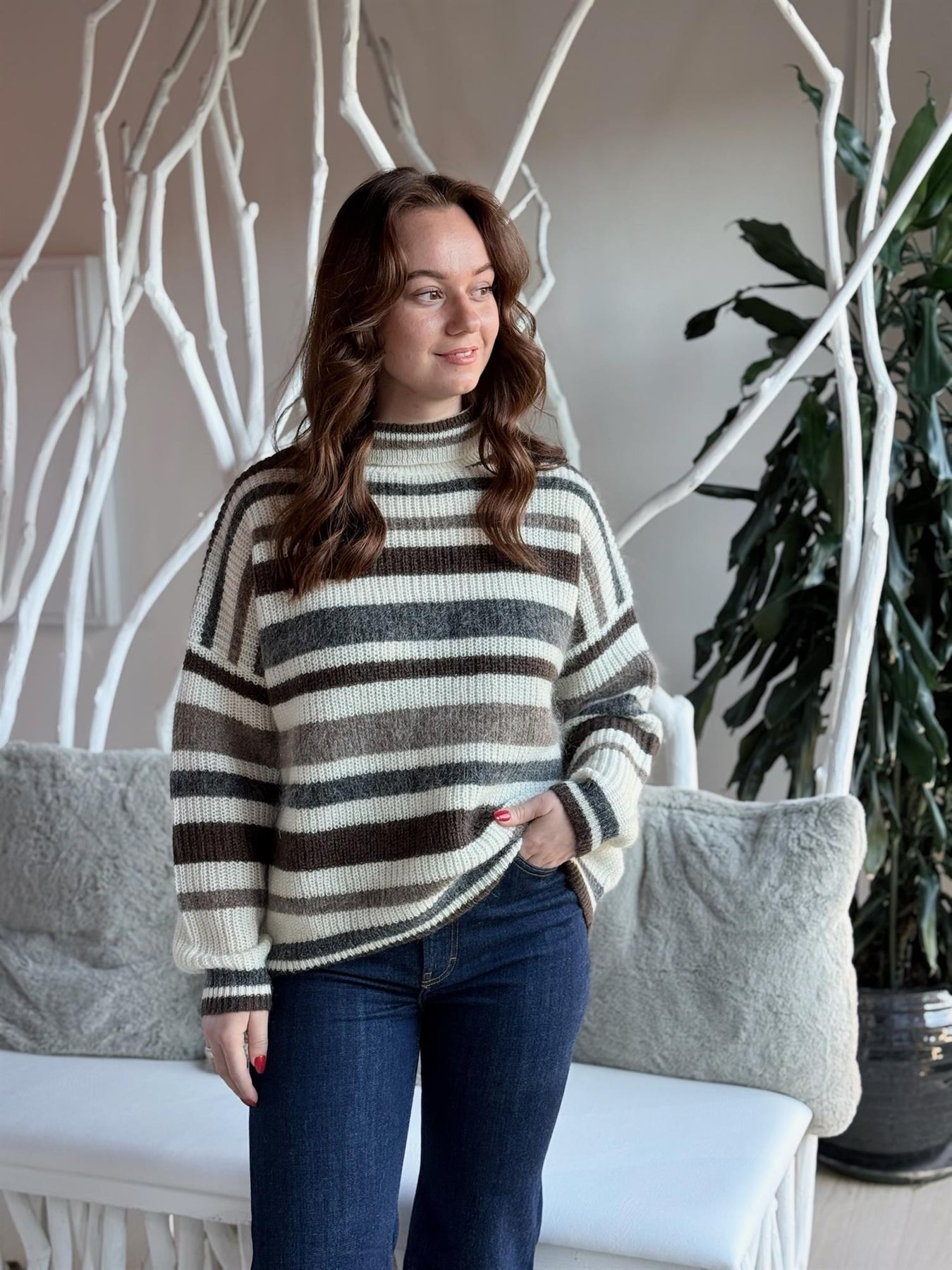 Stellar fra Arnie Says er en myk og voluminøs strikkegenser laget i en lett og fluffy mohairblanding. Genseren har en oversized fasong med høy hals og nedfalne skuldre som gir et avslappet og moderne uttrykk. Den kurvede nederkanten er hakket lengre bak enn foran, noe som gir en flatterende silhuett og ekstra komfort. Perfekt for lag-på-lag styling gjennom høst og vinter.