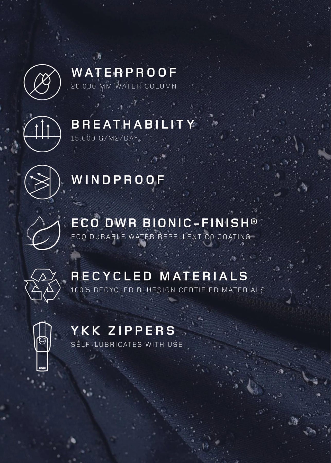 Jakken er laget i slitesterk, resirkulert polyester twill med høy teknisk ytelse. Med en vannsøyle på hele 20.000 mm og god pusteevne holder den deg tørr og komfortabel gjennom skiftende værforhold, og kan brukes store deler av året.