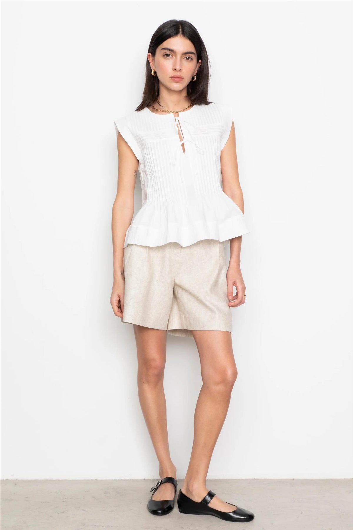 Daria Shorts fra Camilla Pihl er elegante og stilrene shorts med et skreddersydd uttrykk. Den naturlige linfargen gir et sofistikert og sommerlig preg som passer perfekt til både hverdags og mer oppkledde anledninger. Shortsen er designet med høyt liv, frontfolder og vide ben som gir en flatterende og moderne silhuett. Justerbare spenner bak i linningen sikrer optimal passform og gjør plagget både komfortabelt og fleksibelt. Laget i en lett og pustende blanding av lin og viskose, som gir et fint fall og en behagelig følelse på varme dager.