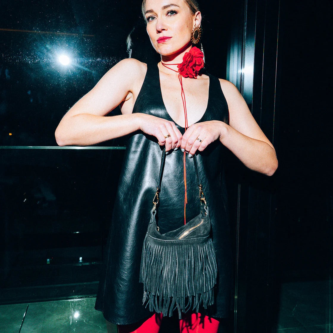 Cento fra Latalia er en stilfull veske i ekte semsket skinn med dekorative frynser som gir et moderne og karakterfullt uttrykk. Den kompakte formen kombinert med de myke materialene gjør vesken både elegant og praktisk til hverdagsbruk.