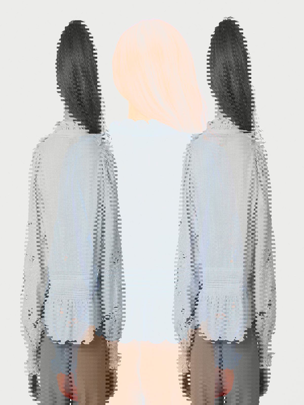 Petrine Embroidery Blouse fra Neo Noir er en elegant og feminin bluse i en delikat lys blå nyanse. Den gir et sofistikert og friskt uttrykk som passer perfekt til både hverdags og mer pyntede anledninger. Blusen er laget i 100 % bomull, som gir en lett og pustende kvalitet med en myk og behagelig følelse mot huden. De fine broderidetaljene tilfører et eksklusivt preg og gjør plagget ekstra dekorativt. En allsidig bluse som enkelt kan styles med både jeans, skjørt eller dressbukser for en gjennomført look.