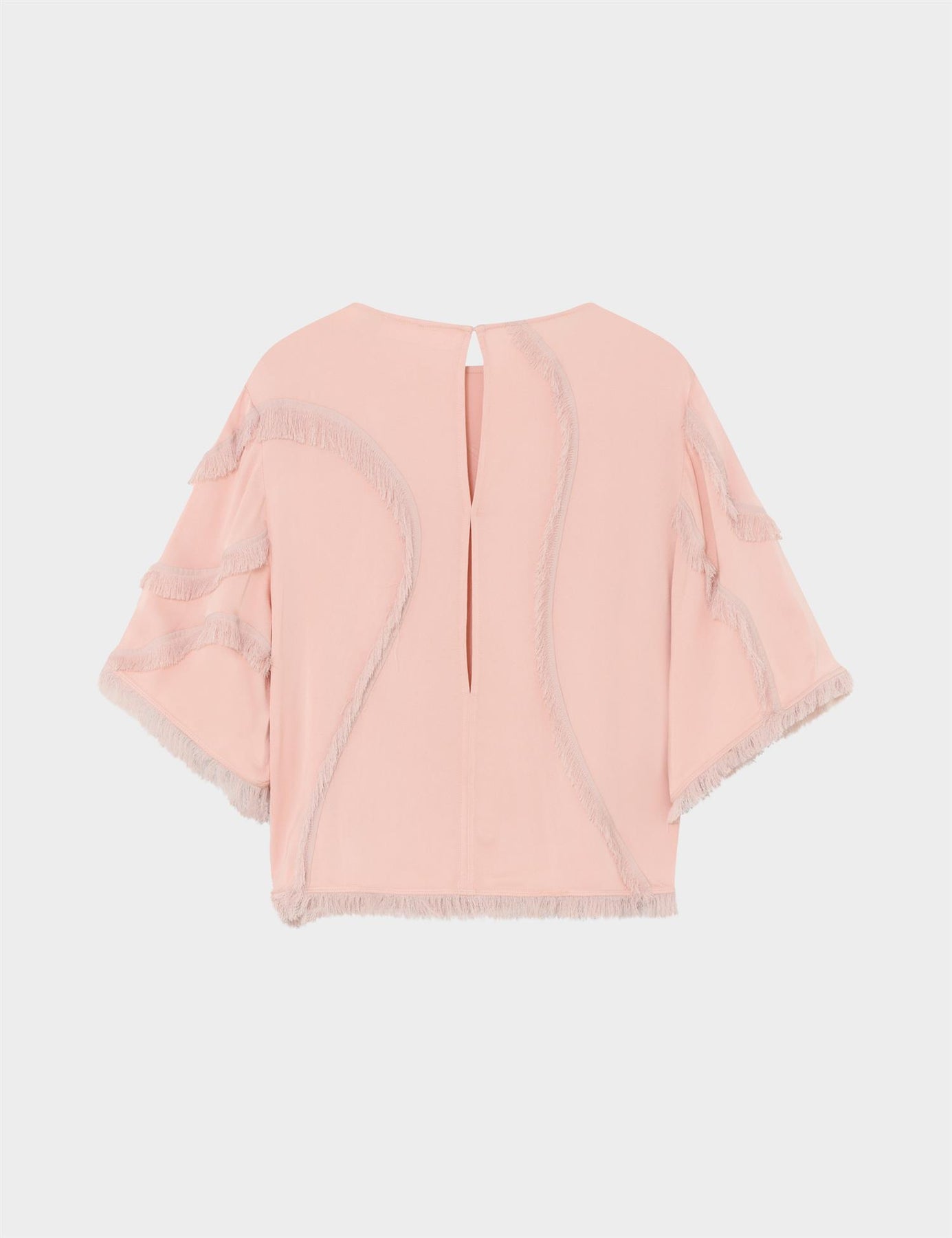 Blusen sitter ledig på kroppen og har korte, vide ermer som skaper en luftig og behagelig silhuett. Dekorative sømmer og subtile volangdetaljer gir plagget et raffinert preg, mens den runde halsen holder uttrykket rent og klassisk. Et allsidig plagg som fungerer like godt til dressbukser som til skjørt eller jeans.