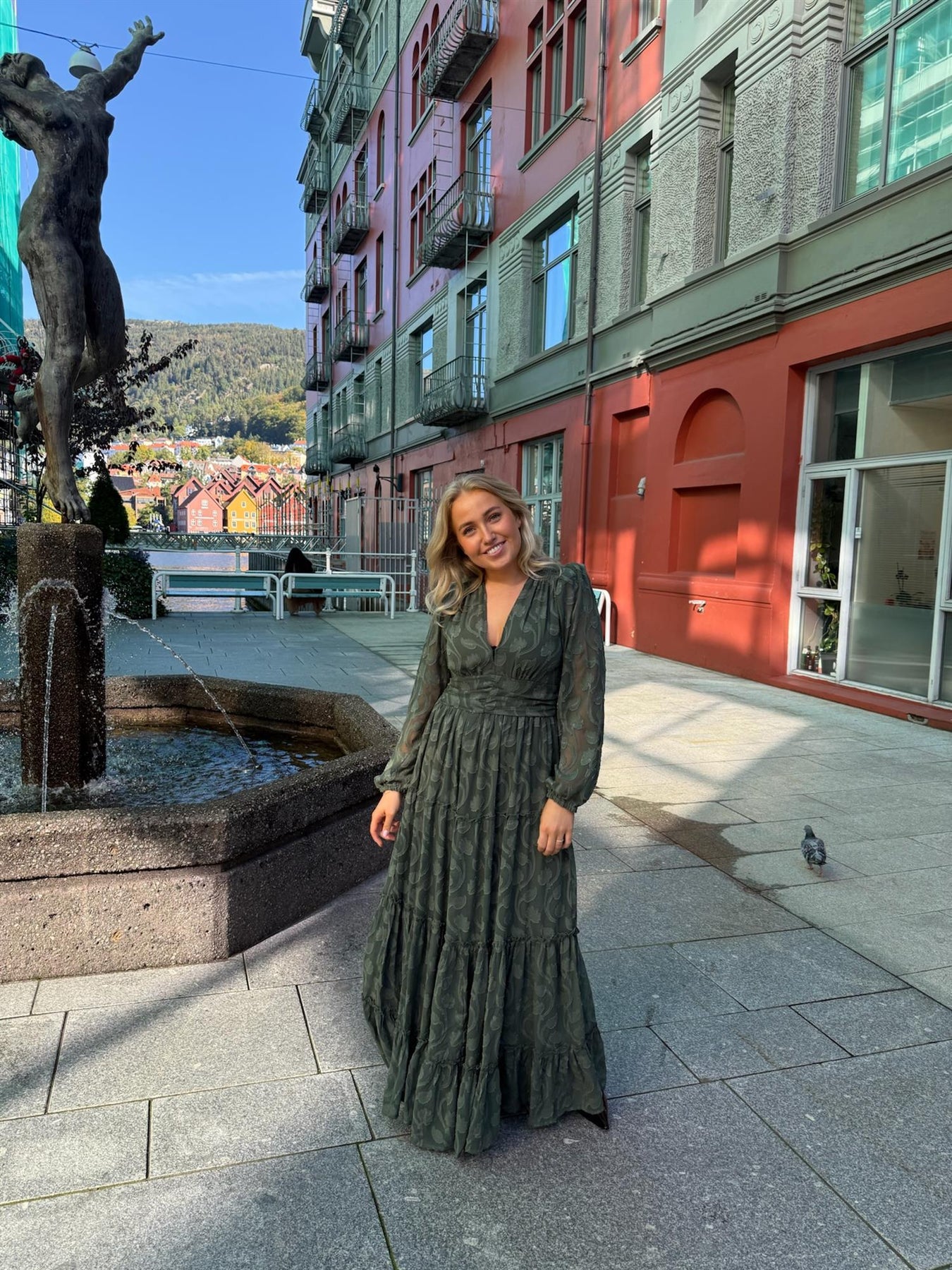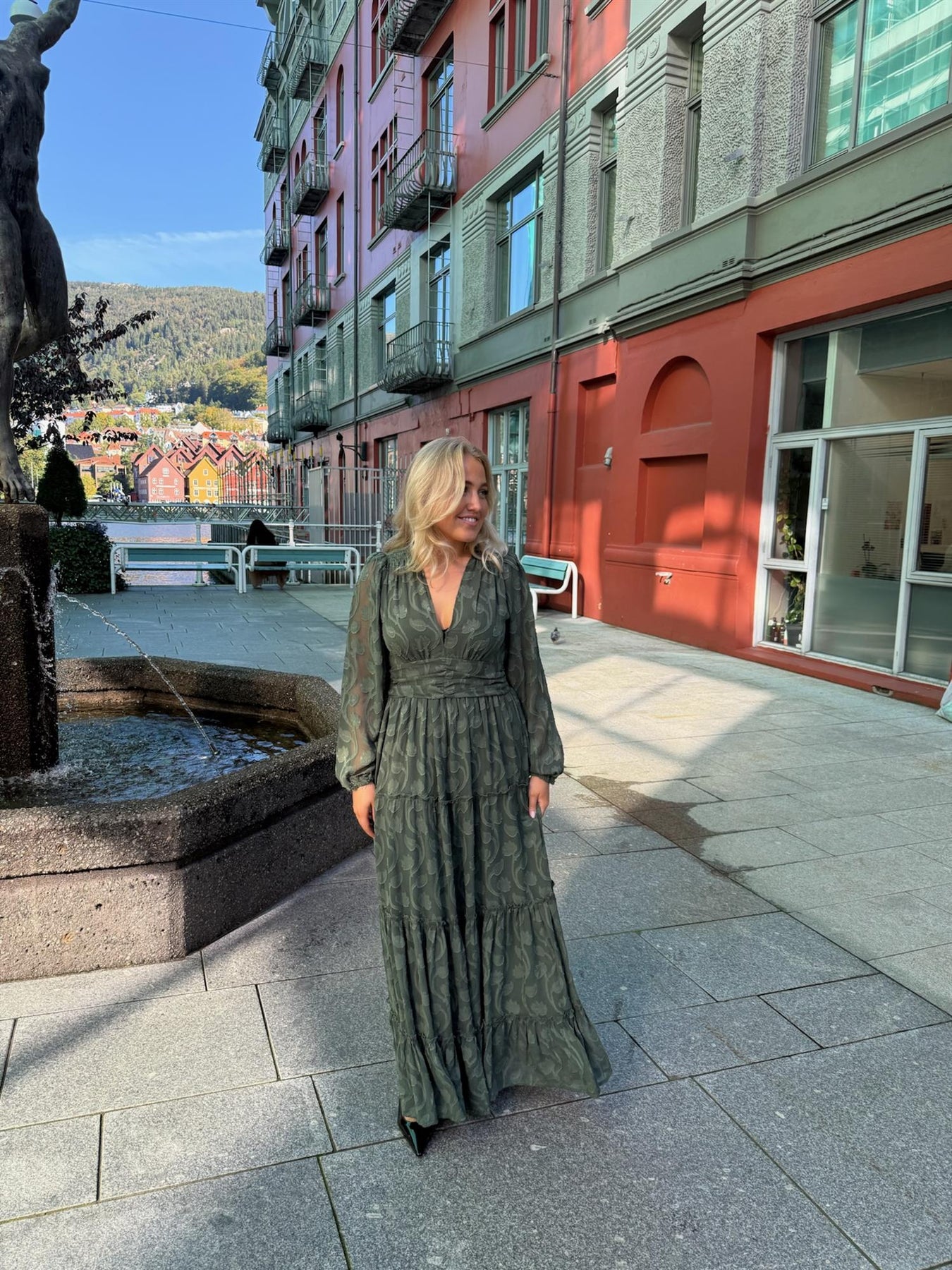 Noor Maxi Dress fra Missmaya er en elegant kjole laget i lett georgette-kvalitet av 100 % polyester. Kjolen har en flatterende silhuett med tettsittende midje, plisserte detaljer og vaffelsøm bak som gir en feminin passform. Den har maxilengde, V-hals og lukkes i siden med glidelås. Lange puffermer med elastiske mansjetter tilfører et romantisk preg. Med sin komfortable passform og tidløse uttrykk er dette en kjole som passer perfekt til både hverdags og fest.