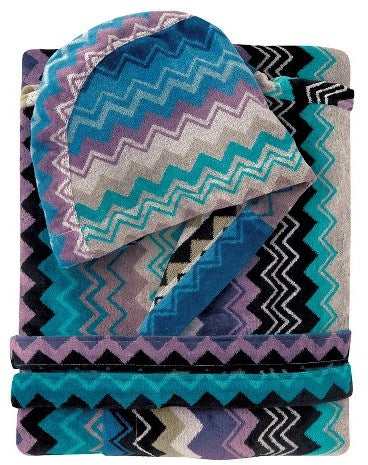 Giacomo er en luksuriøs og komfortabel badekåpe med Missonis klassiske mønster. Badekåpen har myk velour på utsiden og et høyt absorbert håndkle på innsiden. Badekåpen har hette, belte og to lommer. I Giacomo-serien finner du også håndklær, badehåndklær, badehåndklær og badematter.
