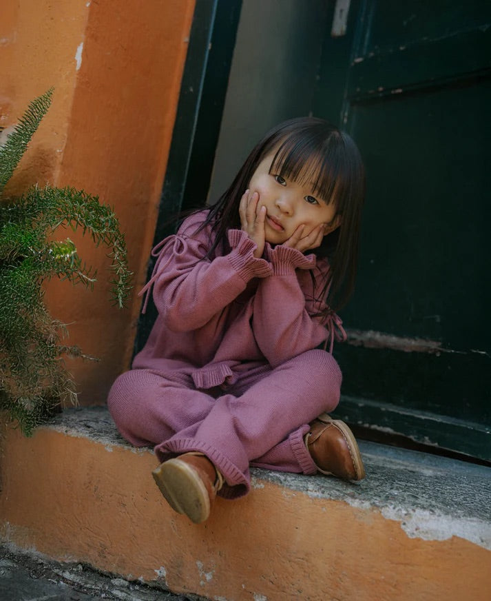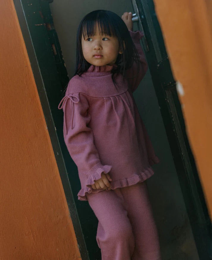 En yndig og elegant strikkegenser med feminine detaljer perfekt både til hverdagsbruk og spesielle anledninger. Genseren har et vakkert rundstrikket bærestykke med delikate volanger ved hals, ermer og kant. De små knytebåndene på skuldrene gir et sjarmerende preg, mens den løse passformen gjør den behagelig å ha på. Et romantisk og tidløst design som passer like fint til bukser som til skjørt.