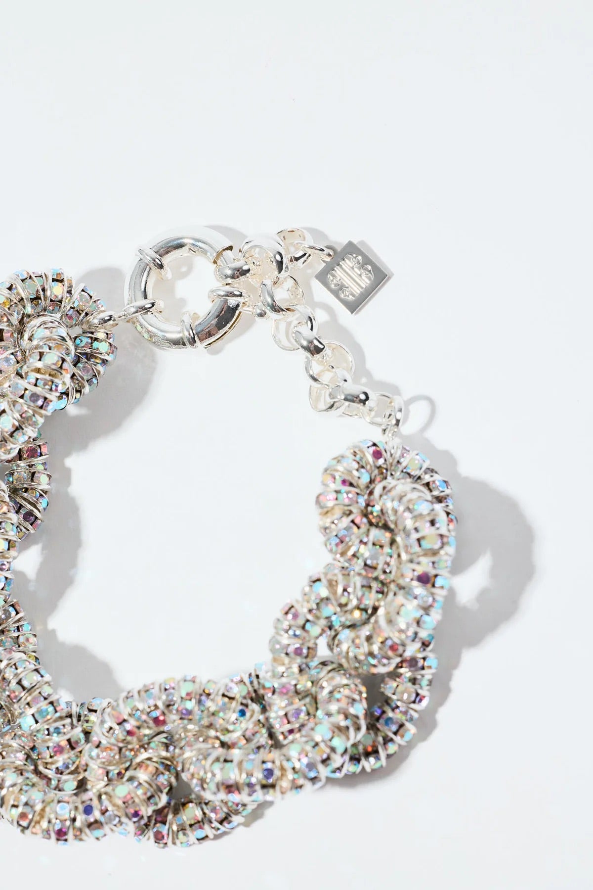 Tiny Tire Bracelet fra Pearl Octopuss.y er en elegant, nedskalert versjon av det ikoniske Diamond Tire Bracelet. Armbåndet består av sammenkoblede, glitrende hoops som skaper en organisk, tvistet form. Krystallenes iriserende glans tilfører et mykt og eksklusivt uttrykk, og balanserer det feminine og maskuline på en sofistikert måte.