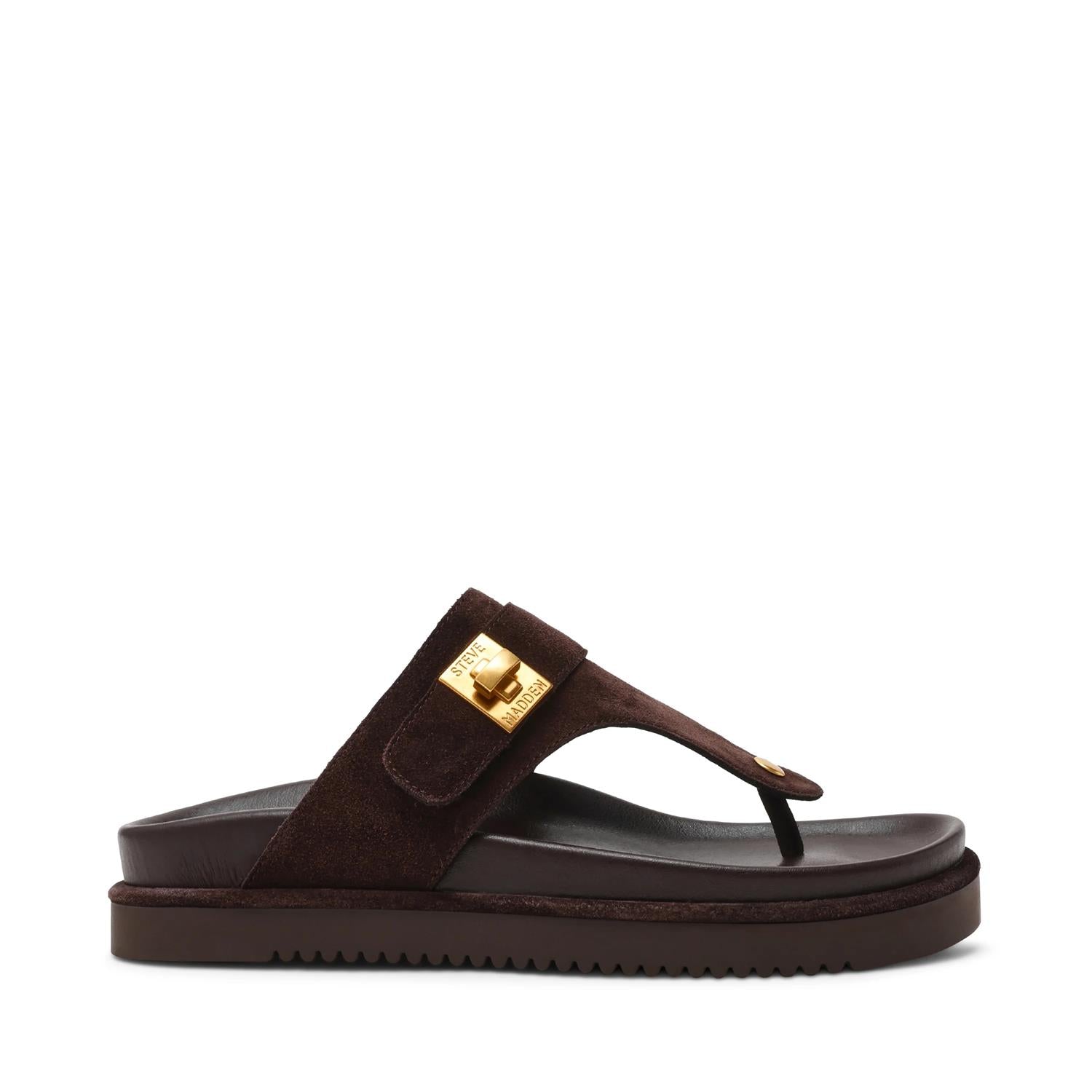 Tuned-In sandal fra Steve Madden er en trendy og komfortabel slip-on som kombinerer minimalistisk design med et eksklusivt uttrykk. Den brede remmen i myk semsket skinn gir en luksuriøs følelse, mens den gullfargede detaljen tilfører et sofistikert preg.