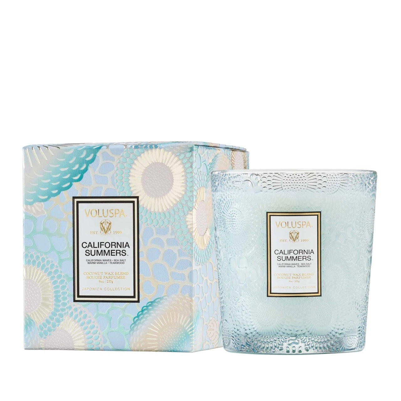 California Summer av Voluspa med lukt av havsalt, varm vanilje og teak. Stearinlyset helles for hånd i USA og har proprietære, rentbrennende kokosnøttvoksblanding og 100% naturlige veker. Voluspa er fri for ftalater, plantevernmidler, parabener og sulfater og er aldri testet på dyr.
