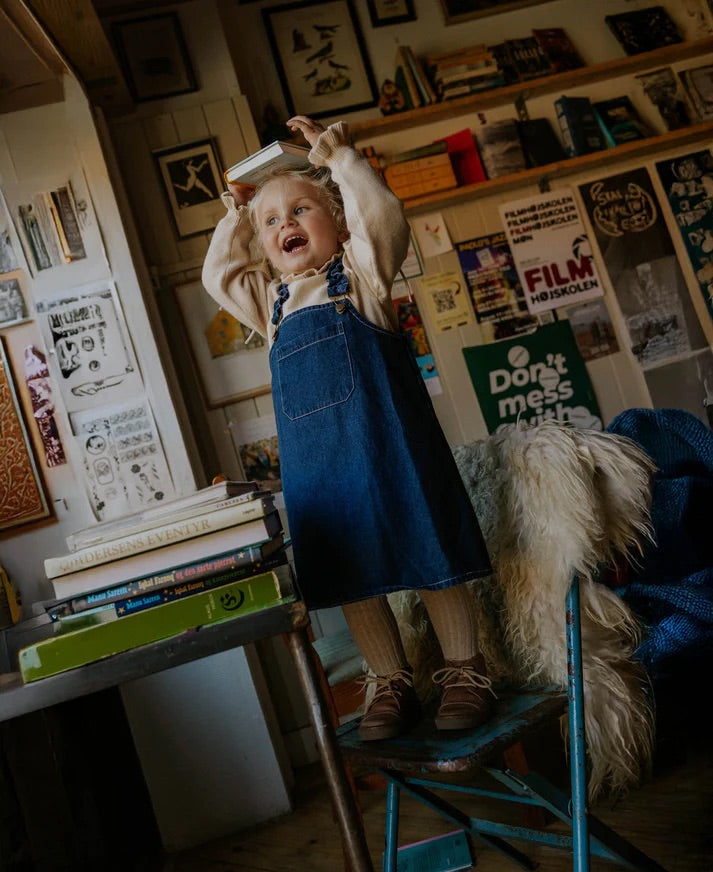 Don Denim Overalldress fra Fliink er en klassisk spencerkjole i denim med justerbare skulderstropper og metallspenner. Kjolen har rynker ved stroppene som gir et feminint uttrykk, samt en liten brystlomme foran. Den har en lett A-fasong som gir god bevegelsesfrihet og gjør den perfekt til lek og hverdagsbruk. Style den gjerne med Kenna Blouse for et komplett antrekk.