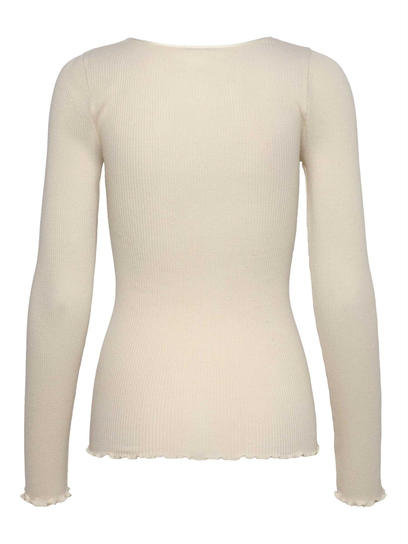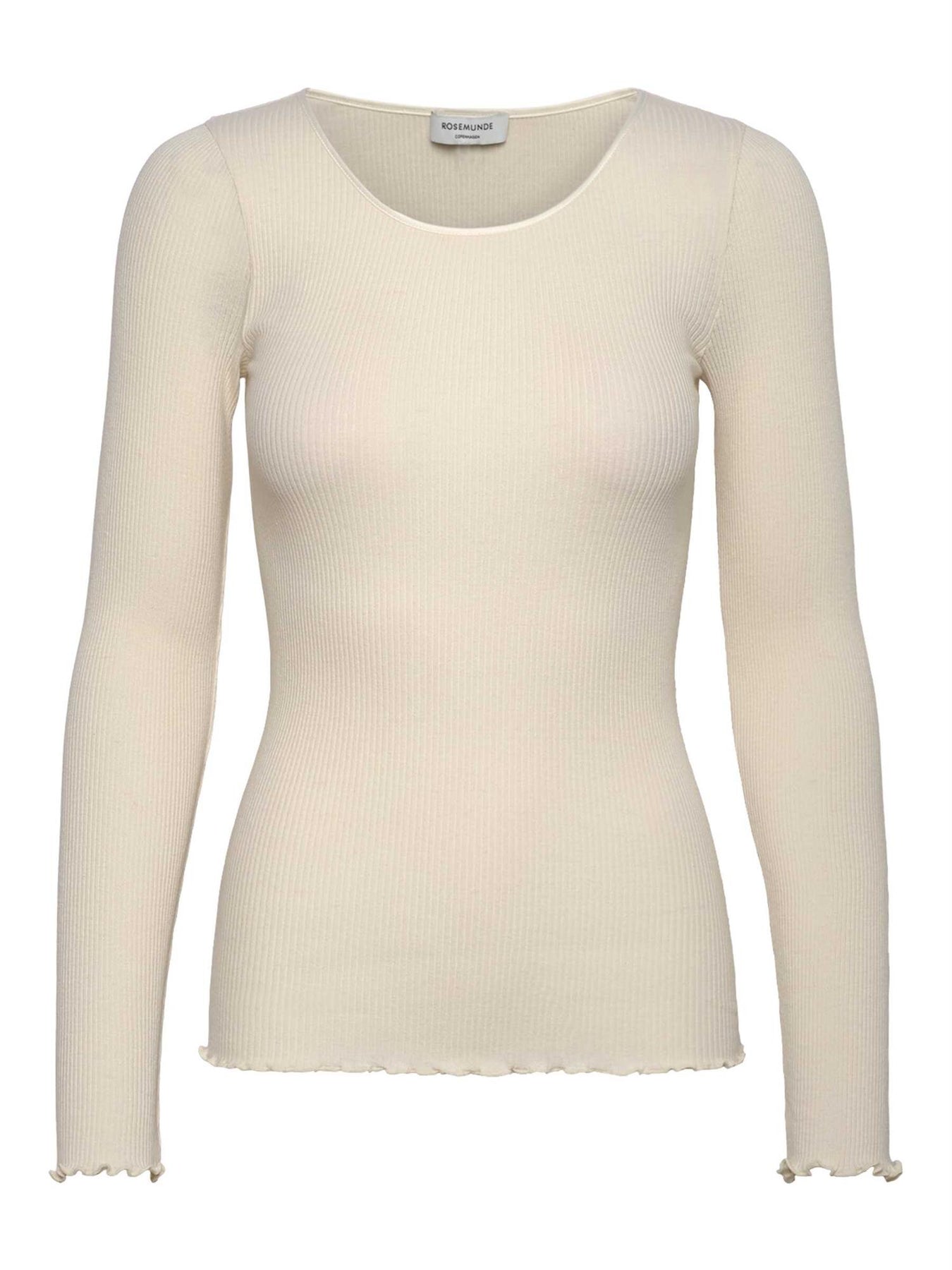 RWMiao Silk LS O-neck T-shirt fra Rosemunde er en elegant langermet basisgenser laget av en luksuriøs blanding av ull og silke. Den har en klassisk rund hals med en smal satengkant som gir et raffinert preg, samt delikate, krøllede kanter nederst for en feminin og tidløs finish. Et perfekt baseplagg som kombinerer komfort, kvalitet og eleganse – et tidløst valg du vender tilbake til sesong etter sesong.