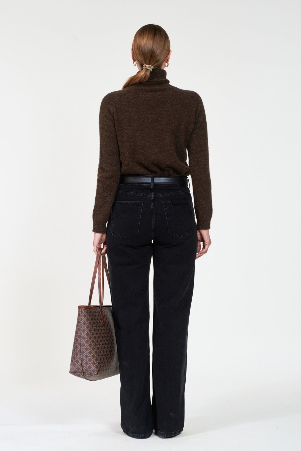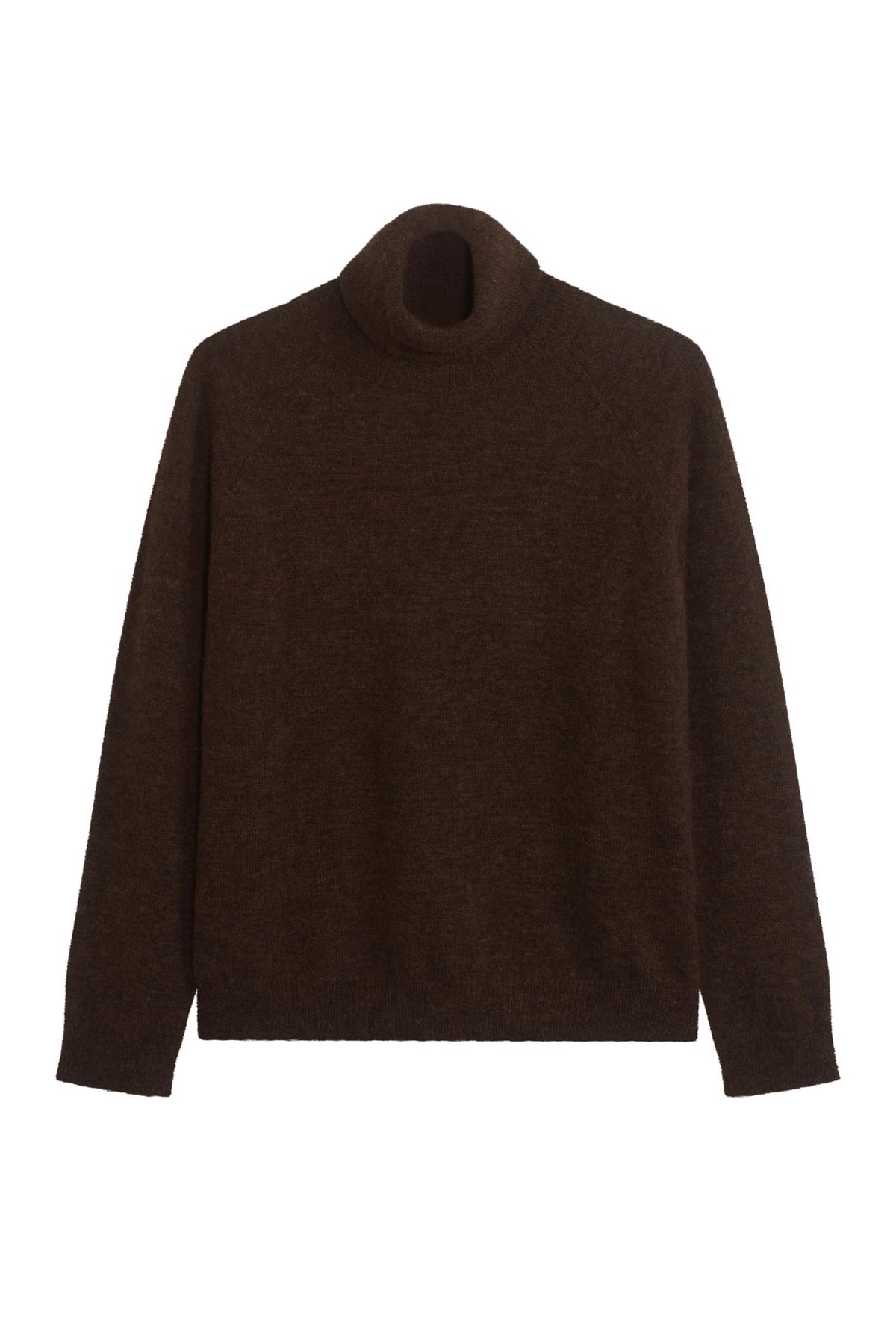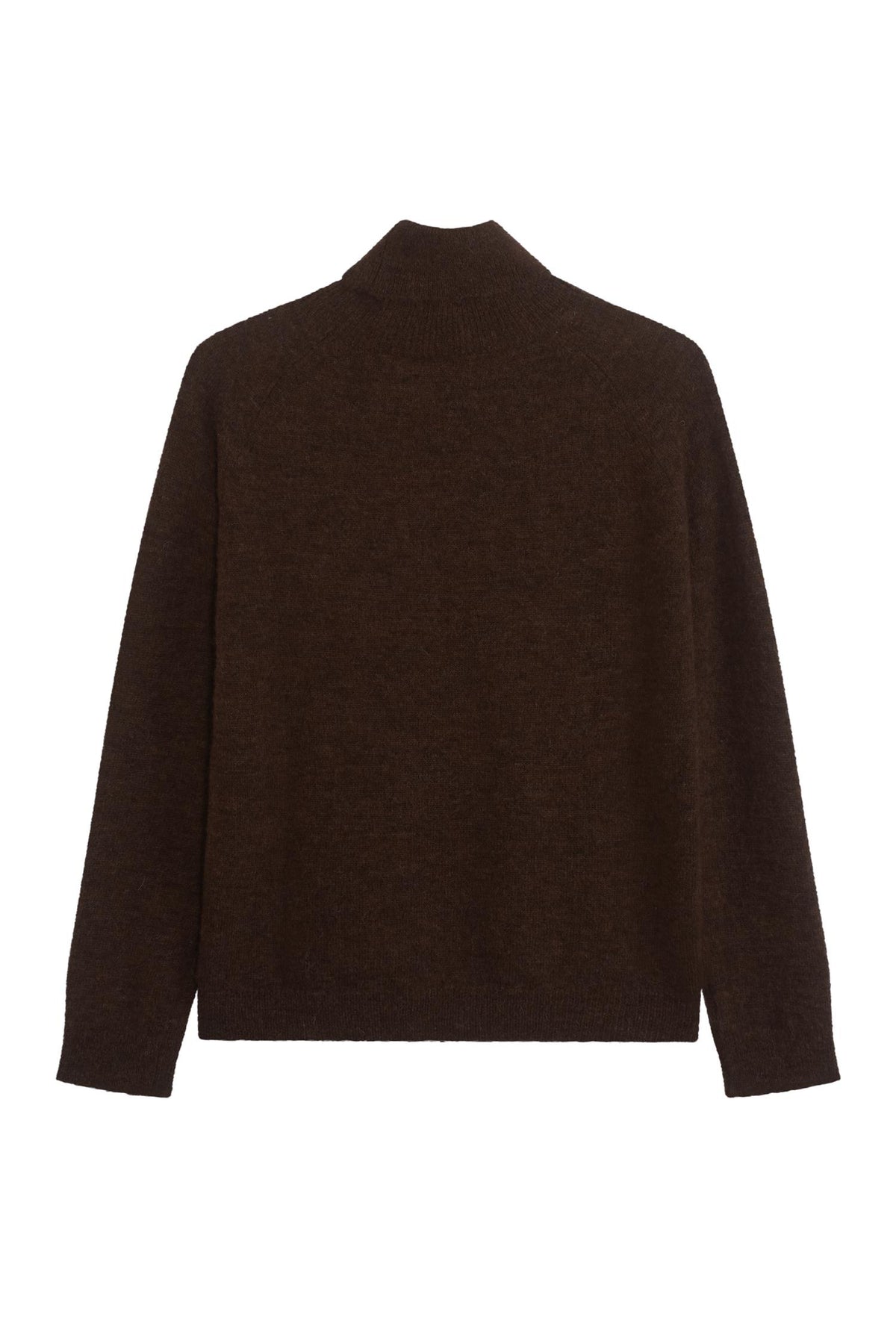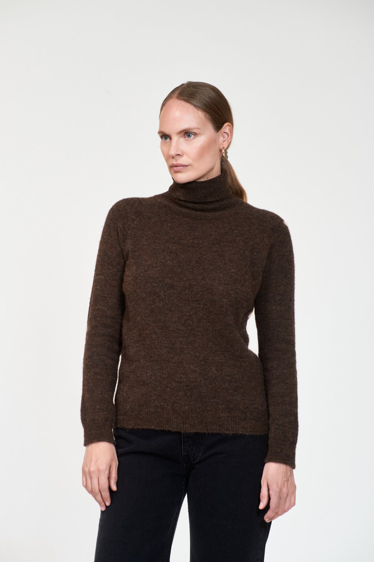 Mia fra Arnie Says er en elegant videreføring av signaturstrikken Fiona. Genseren er strikket i en myk alpakkablanding og designet med en høy, ribbestrikket hals som gir et sofistikert preg. De rette linjene og raglanermene skaper en tidløs silhuett som gir både komfort og stil, perfekt til både hverdag og mer pyntede anledninger.