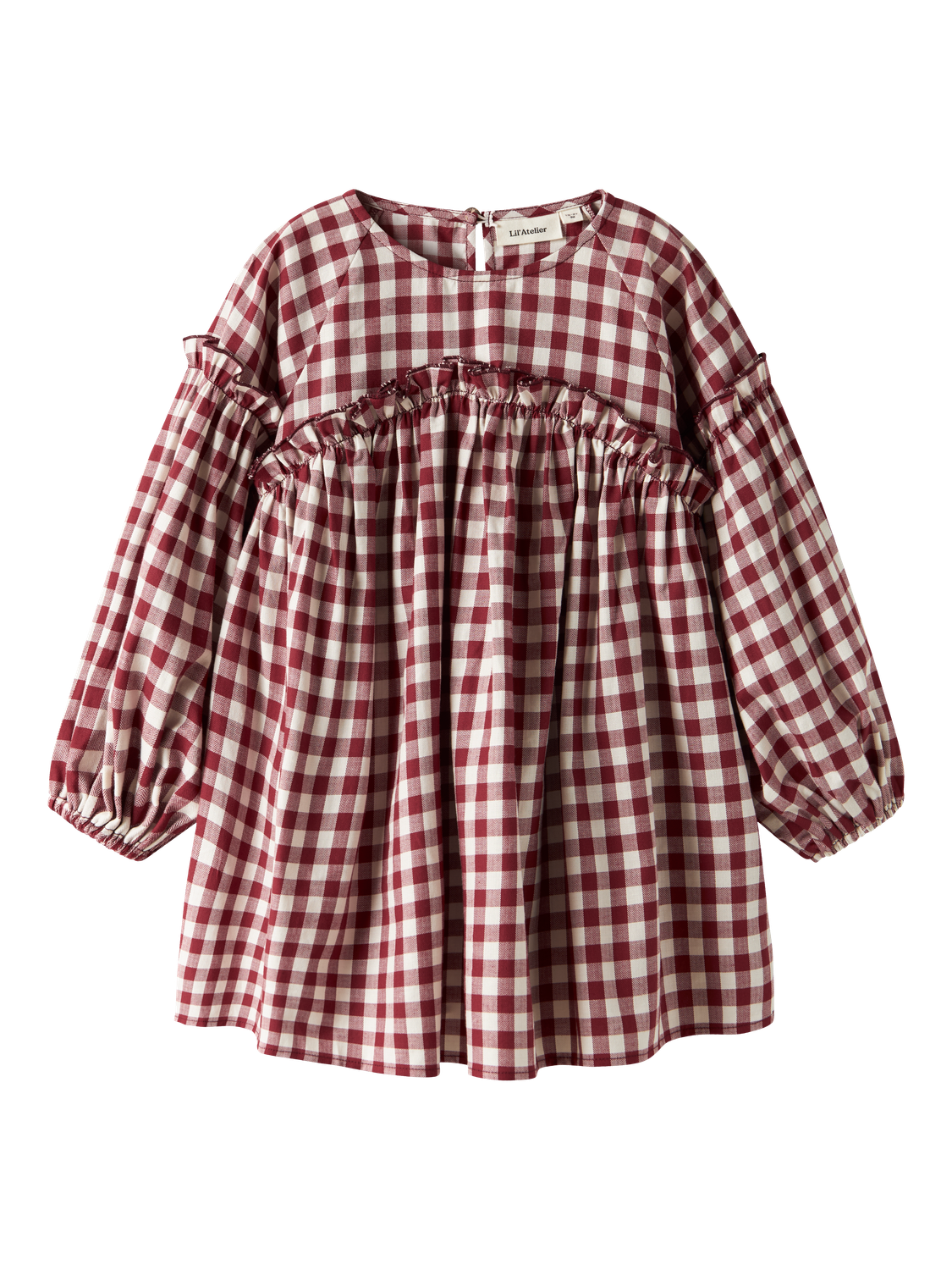 Oppdater barnets garderobe med NMFRio LS Loose Dress fra Lil Atelier, en vakker kjole i fargen Rød Dahlia. Denne kjolen kombinerer tidløs stil med komfort, og er laget av 100 % økologisk bomull som føles myk og pustende mot huden. Med sitt vevde stoff, subtile kryssmønster og rysjedetaljer gir den et klassisk og søtt uttrykk – perfekt for både hverdag og fest.