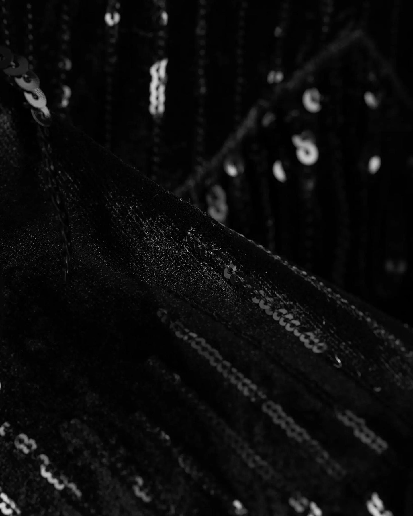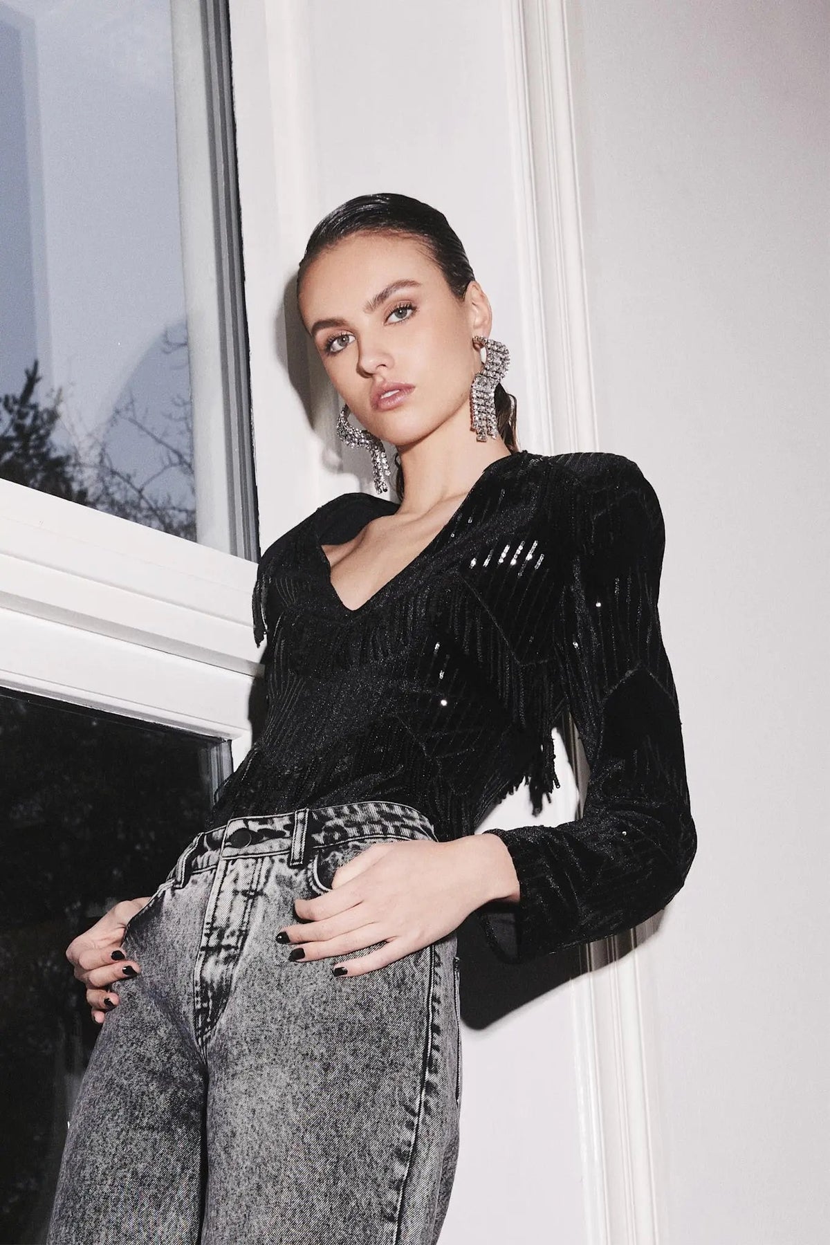 Moonlight Top fra Iben er sesongens statement-plagg. Den er utsmykket med glitrende paljettfranser som gir en levende bevegelse og et luksuriøst uttrykk. En dyp utringning kombinert med markerte skulderputer skaper en selvsikker silhuett, mens skjult glidelås og høy splitt bak tilfører en sofistikert edge.