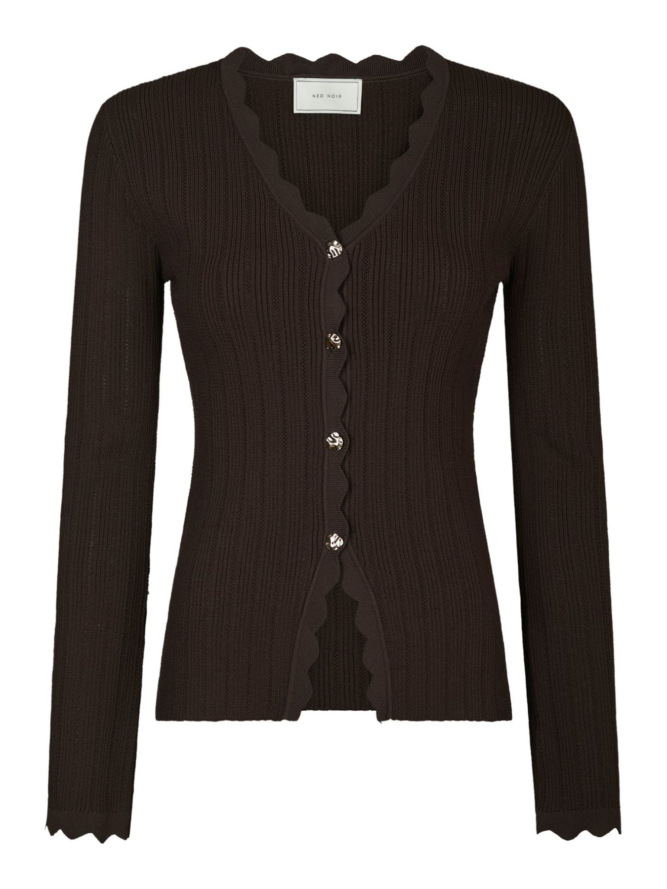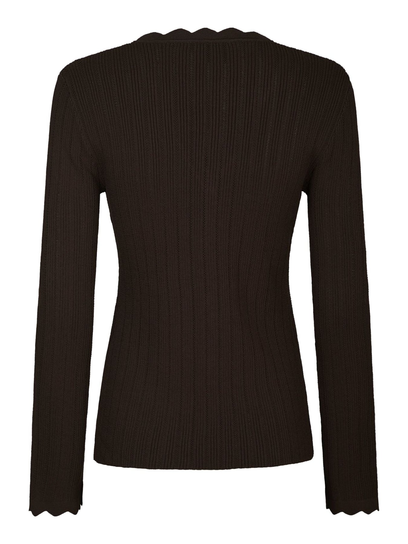 Clara Stitch Knit Blouse fra Neo Noir er en feminin strikkebluse med en sofistikert mørkebrun farge. Laget i en myk og elastisk viskoseblanding, gir den både komfort og et flatterende fall. Den fine strikkestrukturen tilfører et elegant preg, noe som gjør den til et perfekt valg både til hverdags og mer pyntede anledninger.