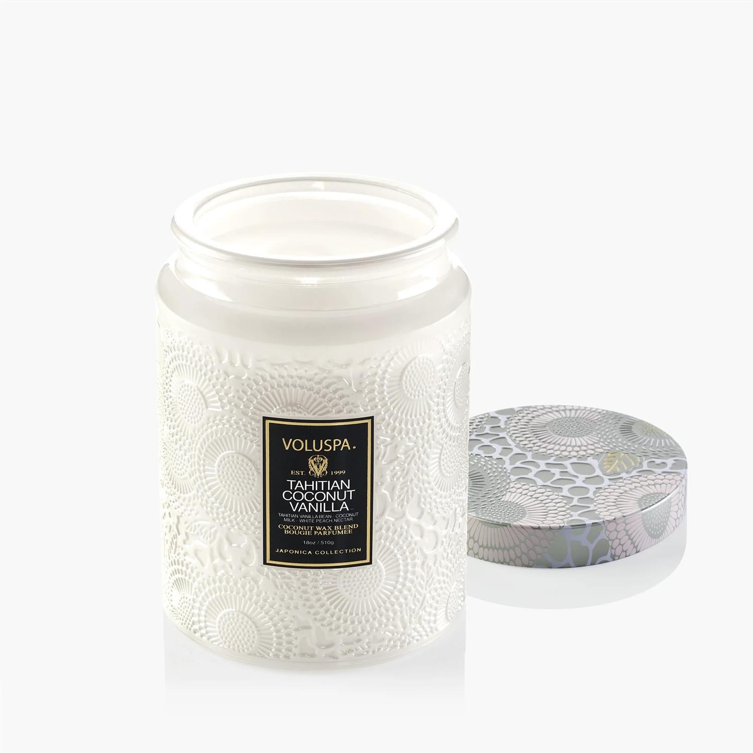 Large Jar Candle duftelys fra VOLUSPA. Noter av tahitisk vaniljestang, kokosmelk og hvit ferskennektar.