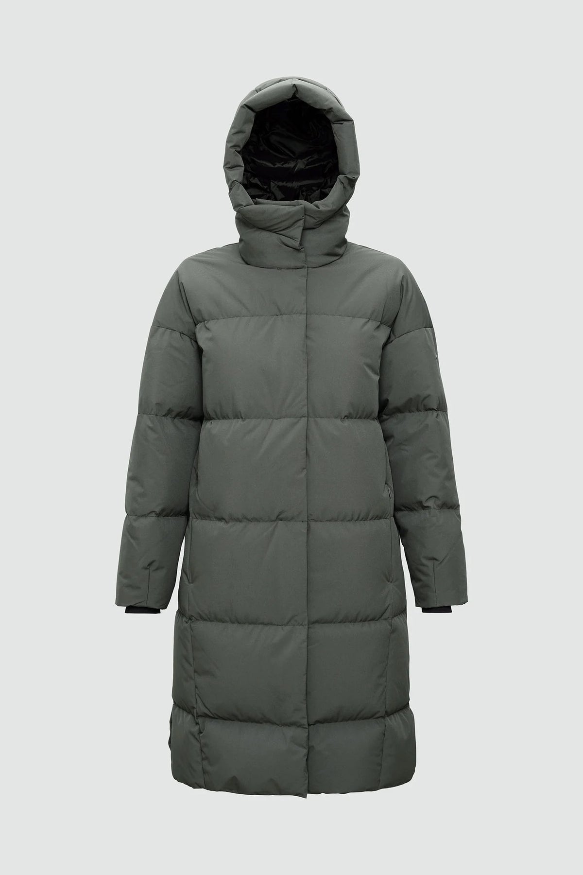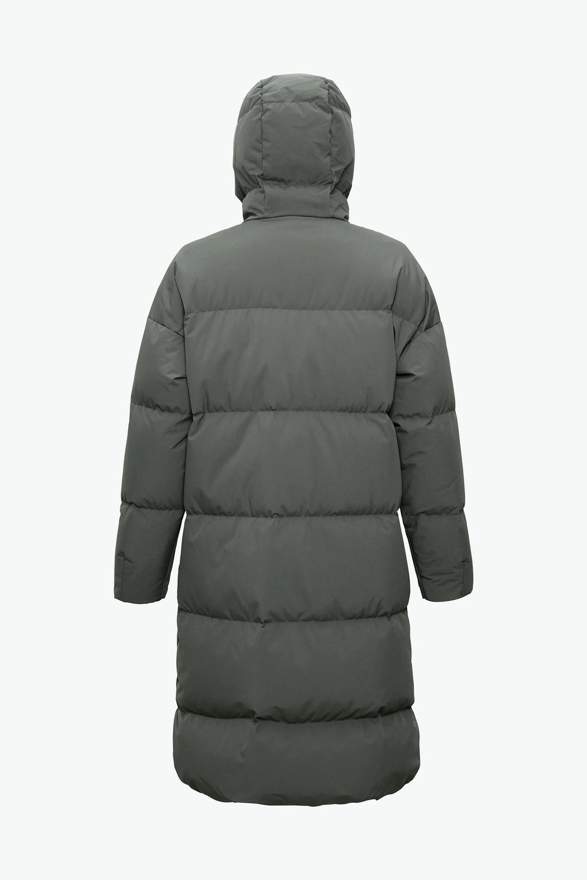 Swell III Coat er en moderne vinterkåpe med en avslappet, oversized passform og en høy krage med fast hette som gir både varme og et distinkt uttrykk. Den lette konstruksjonen gjør at kåpen, til tross for sin lengde og volum, bare veier 980 gram i størrelse Small. Fylt med 90/10 RDS-sertifisert dun med 750 fill power, får du en imponerende varme-til-vekt-ratio som holder deg komfortabel uten å føles tung.
