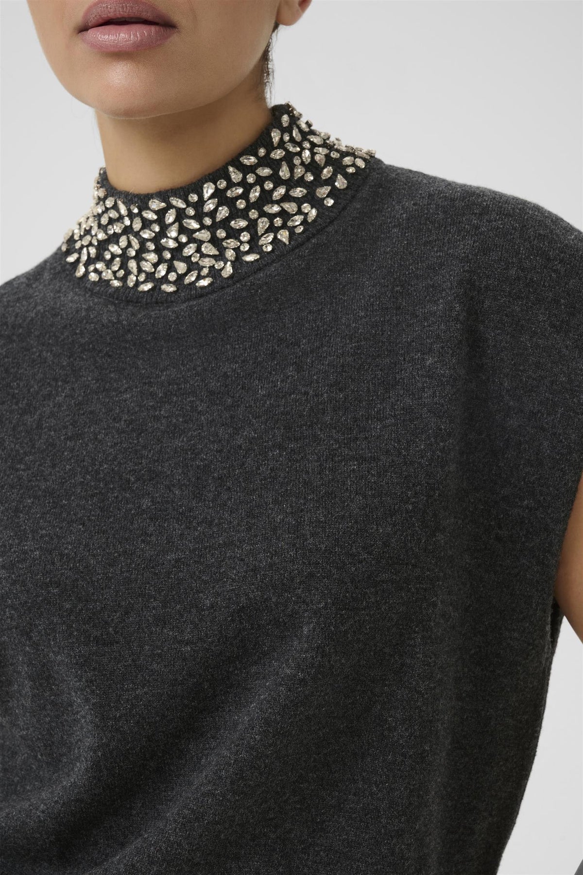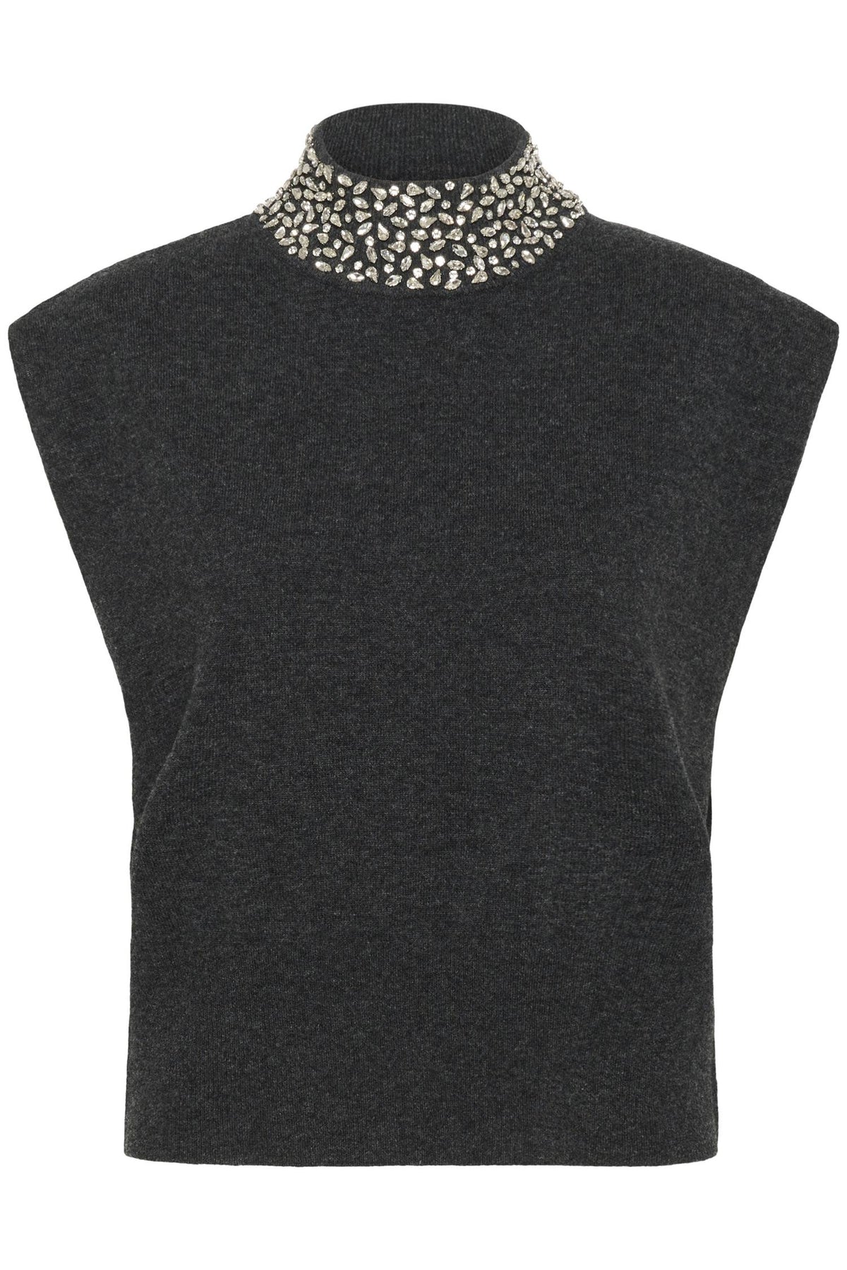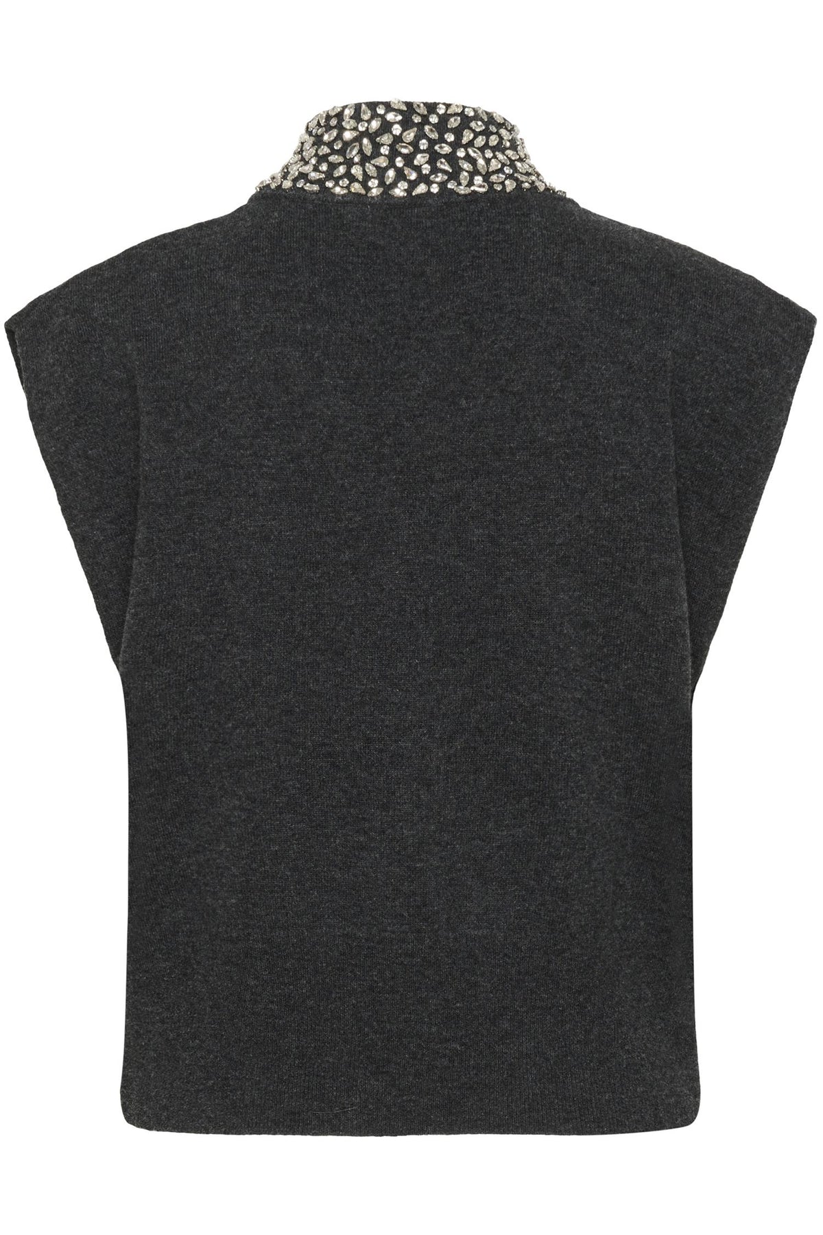 GZManzi Deco Waistcoat fra Gestuz er en elegant, ermeløs strikk som kombinerer minimalistisk design med et luksuriøst uttrykk. Den høye halsen og de glitrende rhinestone-detaljene gir plagget en moderne og sofistikert look – perfekt både alene eller som et lag under blazer eller skjorte. Den rene silhuetten og den myke, sertifiserte ullkvaliteten gjør vesten like komfortabel som den er stilig. Et tidløst statement-plagg som tilfører hverdagsantrekket et hint av glam.