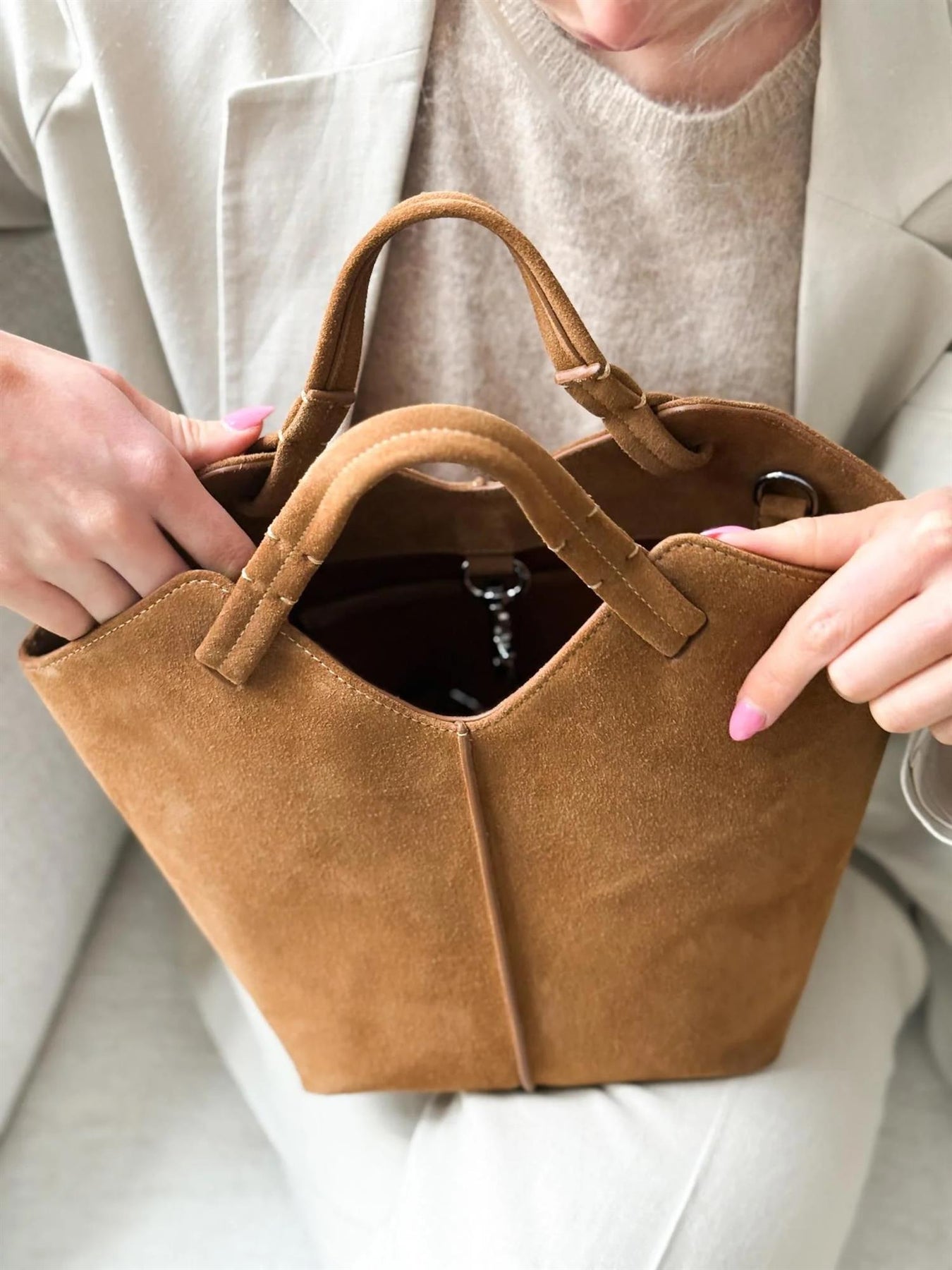 Vesken har praktisk innerlomme for organisering av småting og leveres med støvpose for trygg oppbevaring.