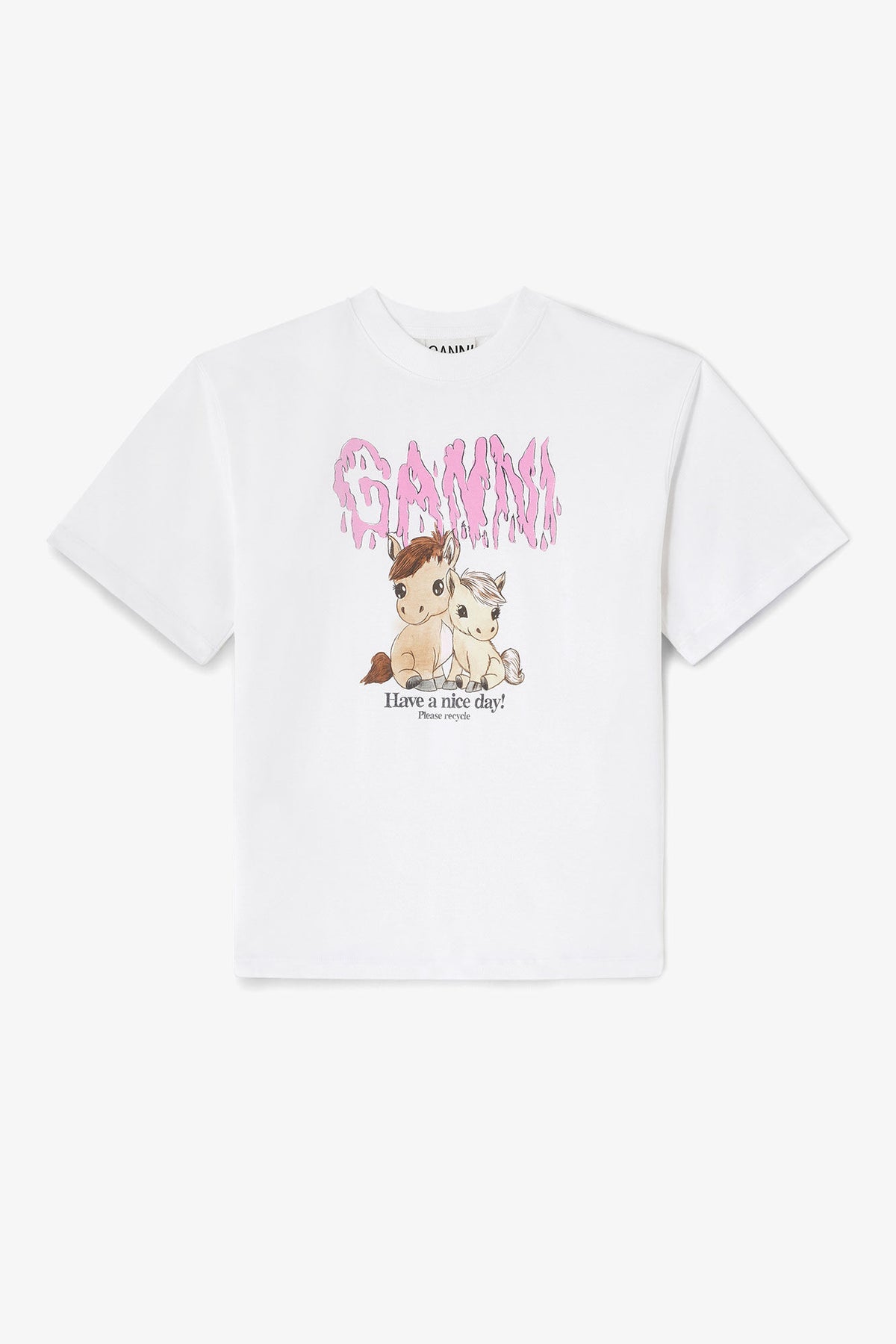 Basic Cotton Jersey T-shirt fra GANNI er en klassisk t-skjorte med GANNIs karakteristiske, lekne uttrykk. Modellen er laget i myk bomullsjersey av 100 % økologisk bomull, med rund hals og korte ermer for en avslappet og anvendelig passform. T-skjorten er dekorert med en trykt ponni-illustrasjon, GANNI-logo og det ikoniske budskapet «Have a nice day! Please recycle!», som gir plagget et tydelig og moderne uttrykk.