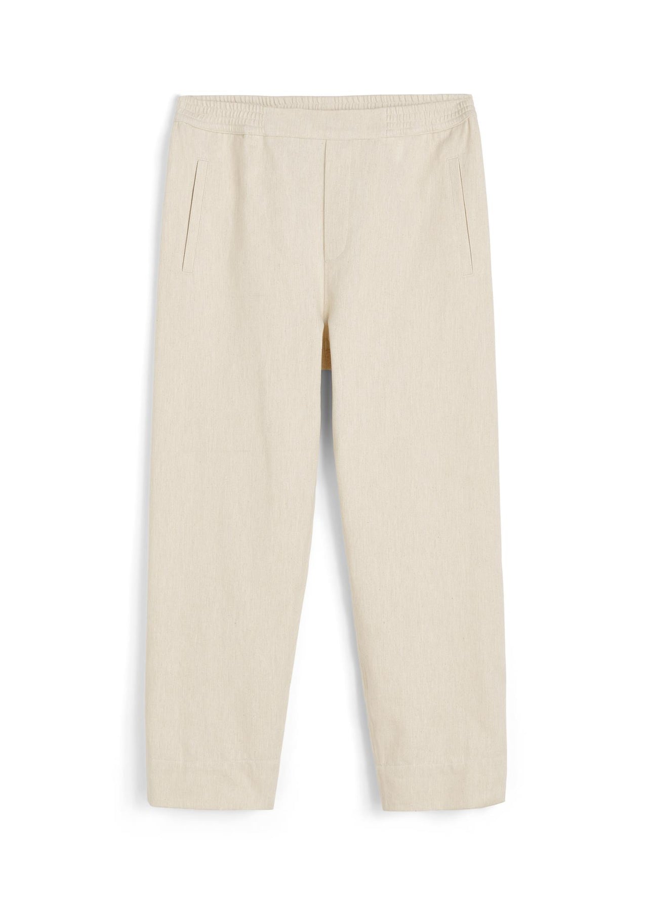 Buksen har bred elastisk linning, praktiske sidelommer og en dekorativ gylfdetalj. Den lett cropped lengden og de rene avslutningene gir et minimalistisk og gjennomført preg.