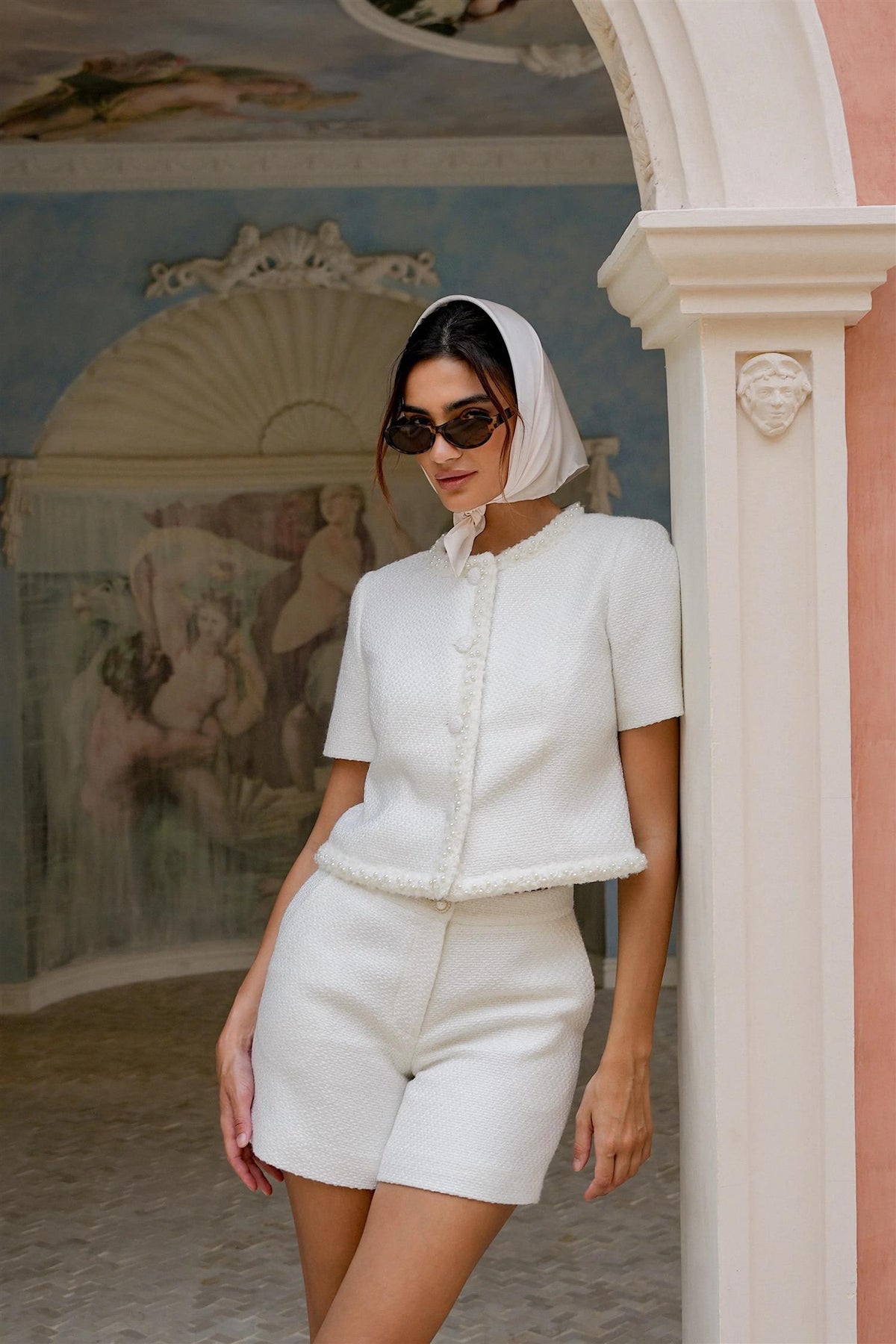 Toppen har korte ermer og en lett cropped passform som gir en moderne og feminin fasong. Den lukkes med stoffkledde knapper foran og er detaljert med flettet kant som tilfører et eksklusivt preg.