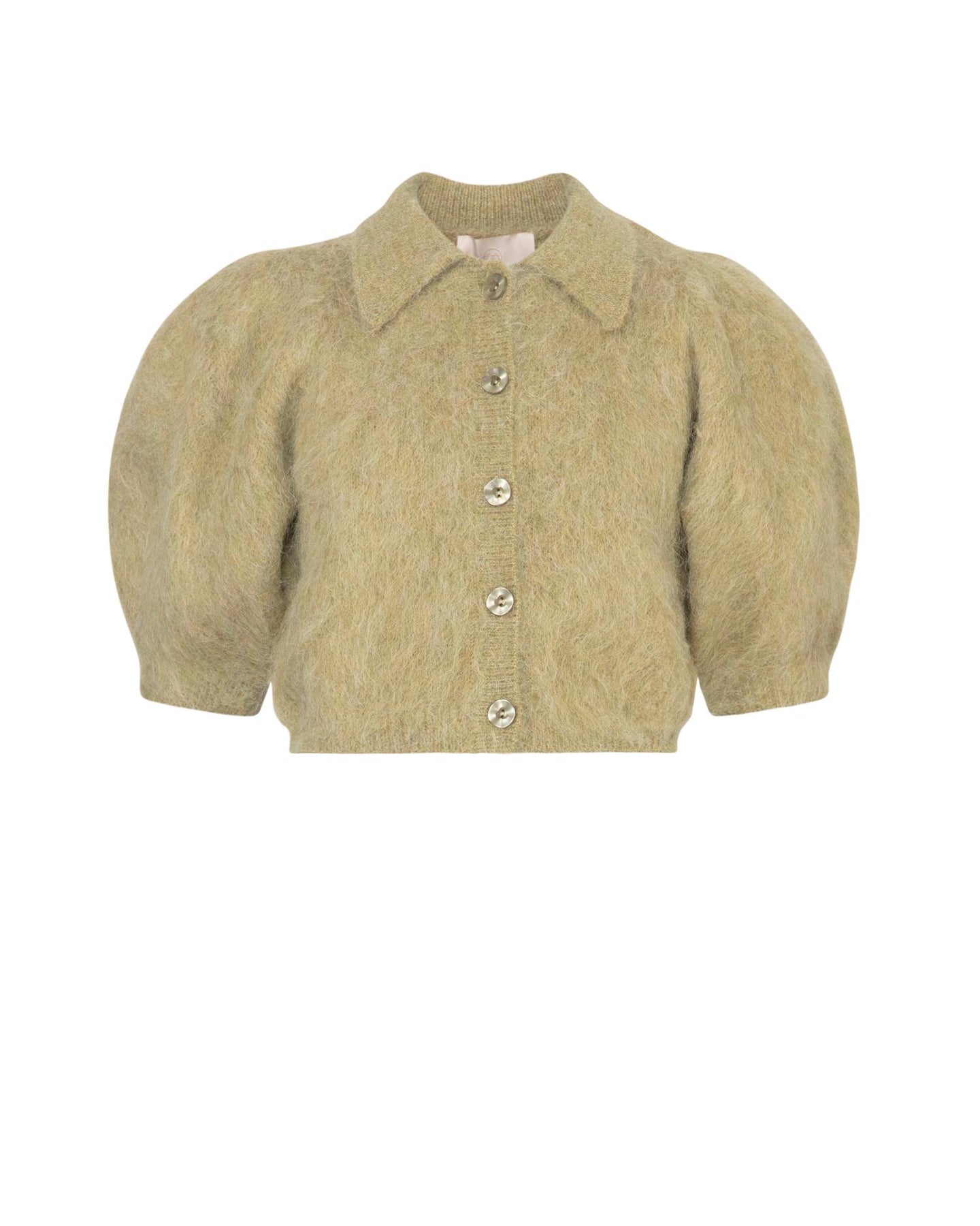 Hairy Knit Puffed Jacket fra byTiMo er en feminin og eksklusiv strikkejakke med et mykt, luftig uttrykk. Den korte, figurnære passformen kombineres med korte puffede ermer og elastiske mansjetter som gir jakken et elegant og sofistikert preg. Den klassiske skjortekragen og de delikate ribbedetaljene i krage, mansjetter og fald tilfører et gjennomført og tidløst uttrykk. Jakken lukkes med knapper i front og er perfekt både som et statement-plagg alene eller som et lekkert lag over kjoler og skjørt. Den delikate grønntonen gir antrekket et friskt og raffinert løft.