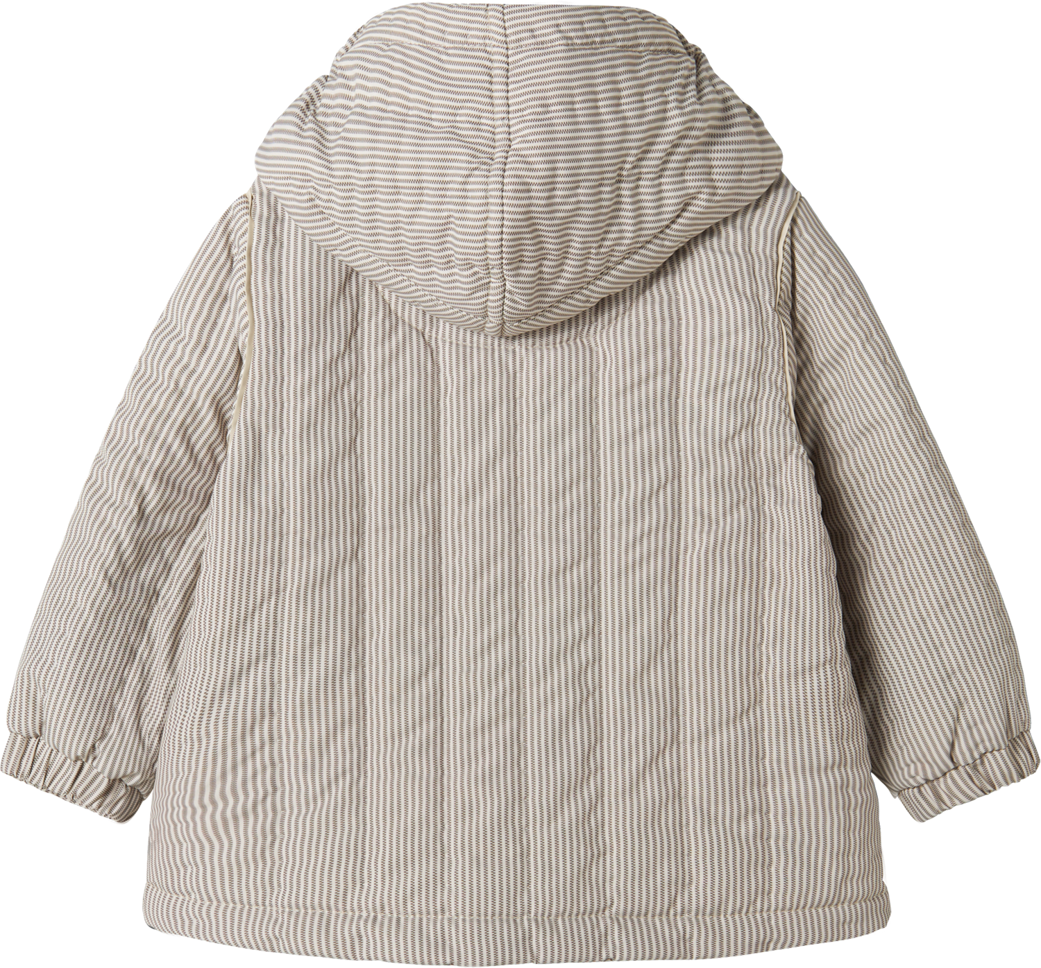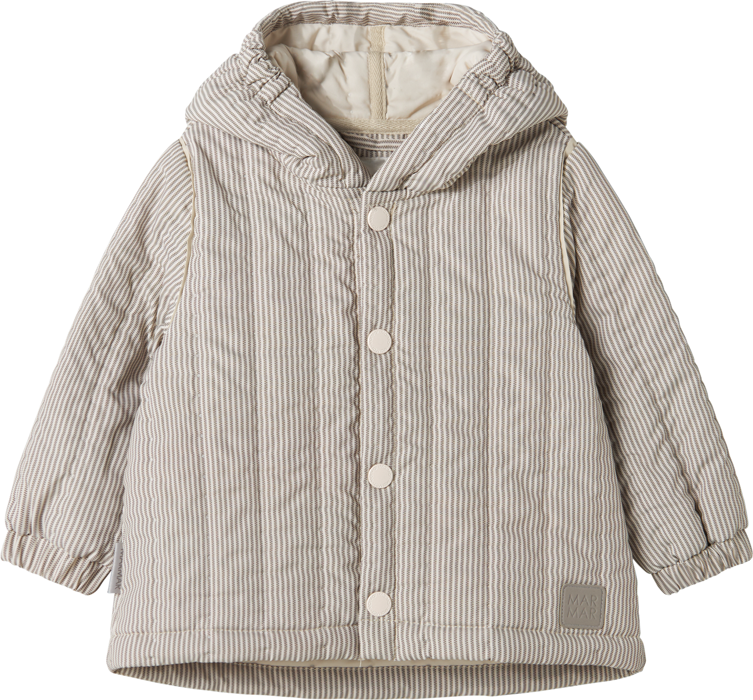 Omaro Jacket fra MarMar er en funksjonell og stilren jakke til barn, designet med fokus på både komfort og praktisk bruk. Jakken har et klassisk stripet uttrykk i Dark Brown Stripe som gir et tidløst og rolig preg, perfekt for både hverdagsbruk og utendørsaktiviteter. Et gjennomført ytterplagg som passer godt til overgangssesonger. Jakken har en komfortabel passform med god bevegelsesfrihet, ideell for aktive barn. Den er utstyrt med hette og knappelukking i front, som gjør den enkel å ta av og på. Den lett vatterte og slitesterke kvaliteten gir god beskyttelse mot kjøligere vær, samtidig som materialvalget gjør jakken behagelig å bruke gjennom hele dagen.