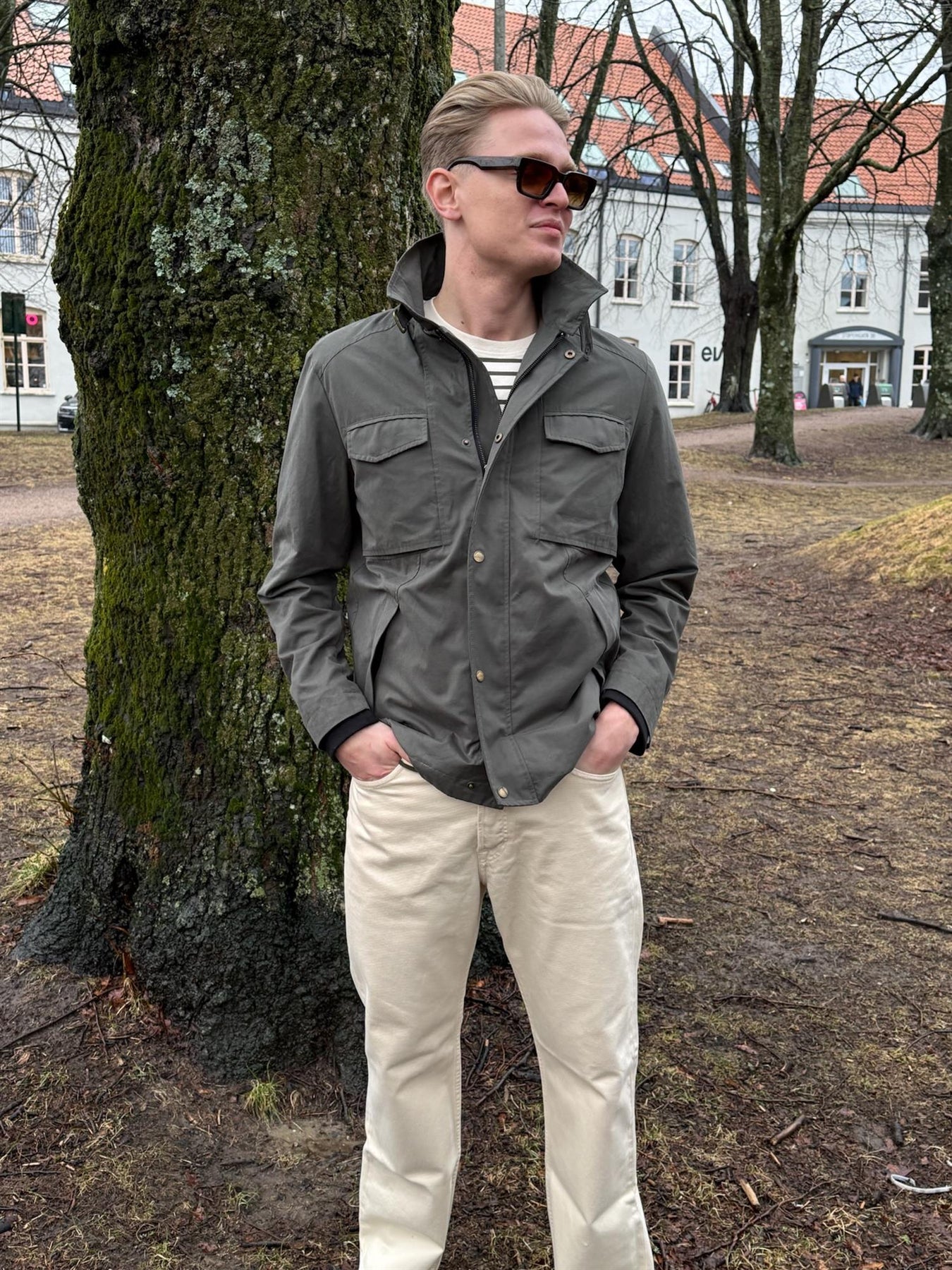 Modellen har en normal passform og rekker til midt på hoften, noe som gir et tidløst og anvendelig snitt som passer de fleste anledninger. Den mørke oliventonen understreker det maskuline uttrykket og gjør jakken enkel å kombinere med både hverdagsantrekk og mer oppkledde looks.