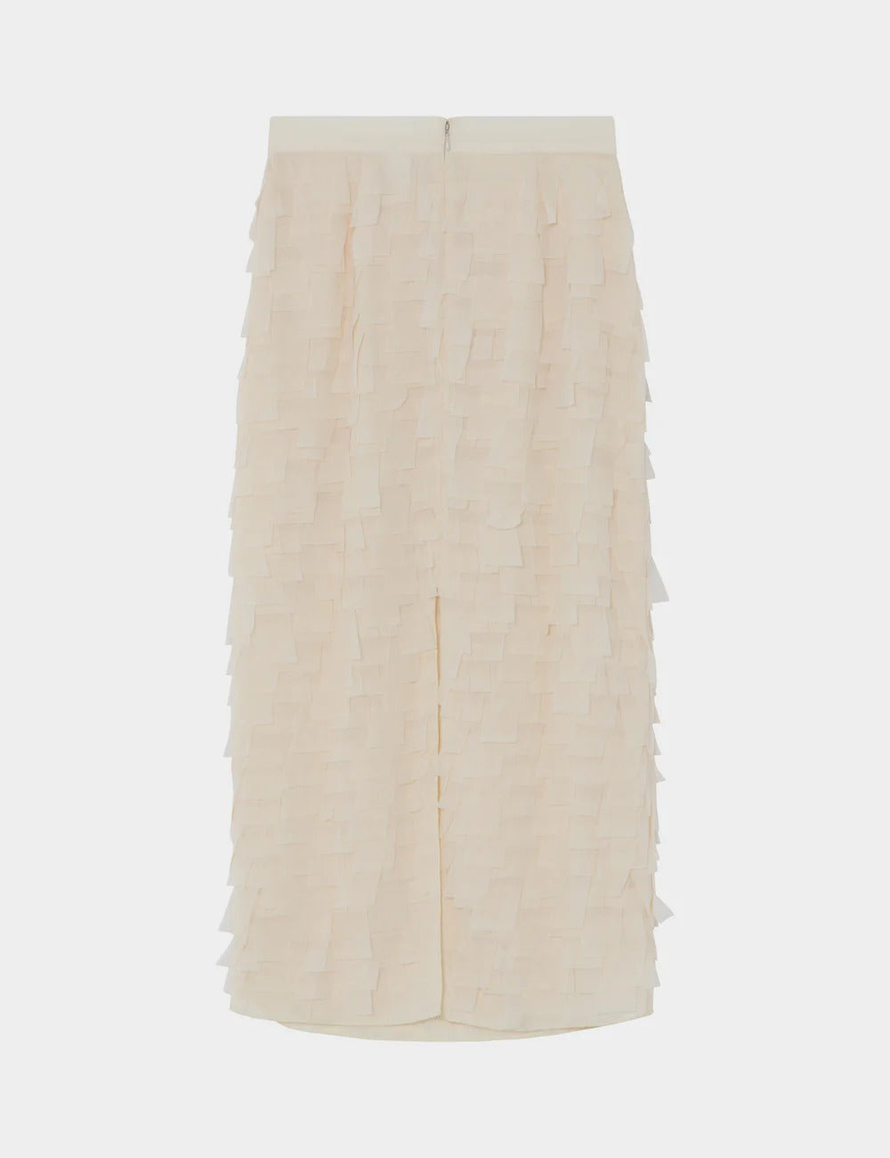 Flow Chiffon Fringe Jet Stream Skirt fra Day Birger et Mikkelsen er et sofistikert og iøynefallende ankellangt skjørt som kombinerer tidløs eleganse med moderne tekstur. Skjørtet er laget i lett chiffon og dekorert med lagdelte, firkantede stoffrynser som gir et vakkert spill og en levende bevegelse når du går. Den smale, flatterende silhuetten balanseres perfekt av den rike strukturen i stoffet. Skjørtet har glidelåslukking bak og en diskret splitt, som gir både komfort og bevegelsesfrihet. Den lyse offwhite-fargen gjør skjørtet enkelt å style – like elegant med en silkebluse og hæler som med en strikkegenser for et mer avslappet uttrykk.