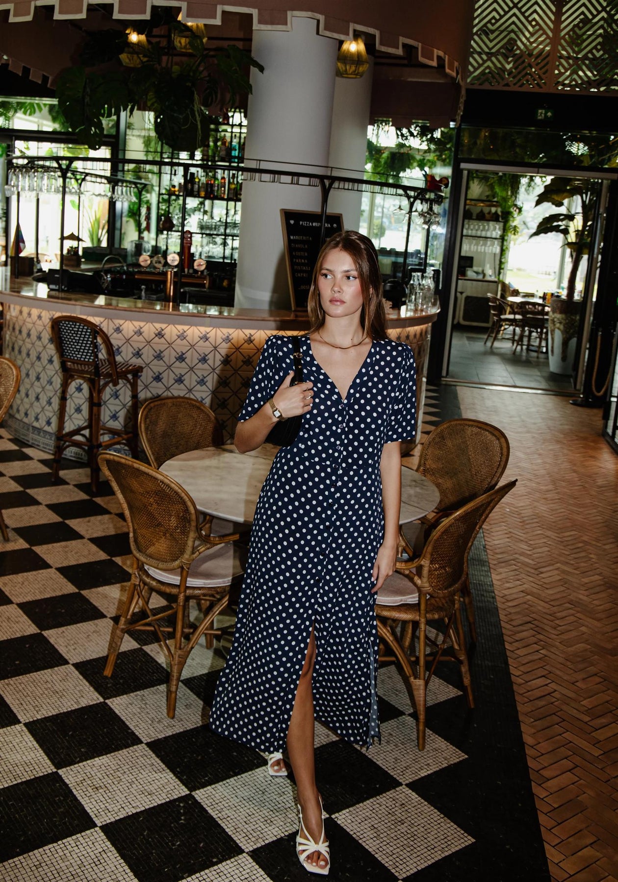 Angela Dress Polka Blue fra MissMaya er en feminin og stilfull midikjole i et klassisk polkaprint. Kjolen er laget i 100 % mosscrepe – et lett og luftig materiale som gir en behagelig passform og flott bevegelse.