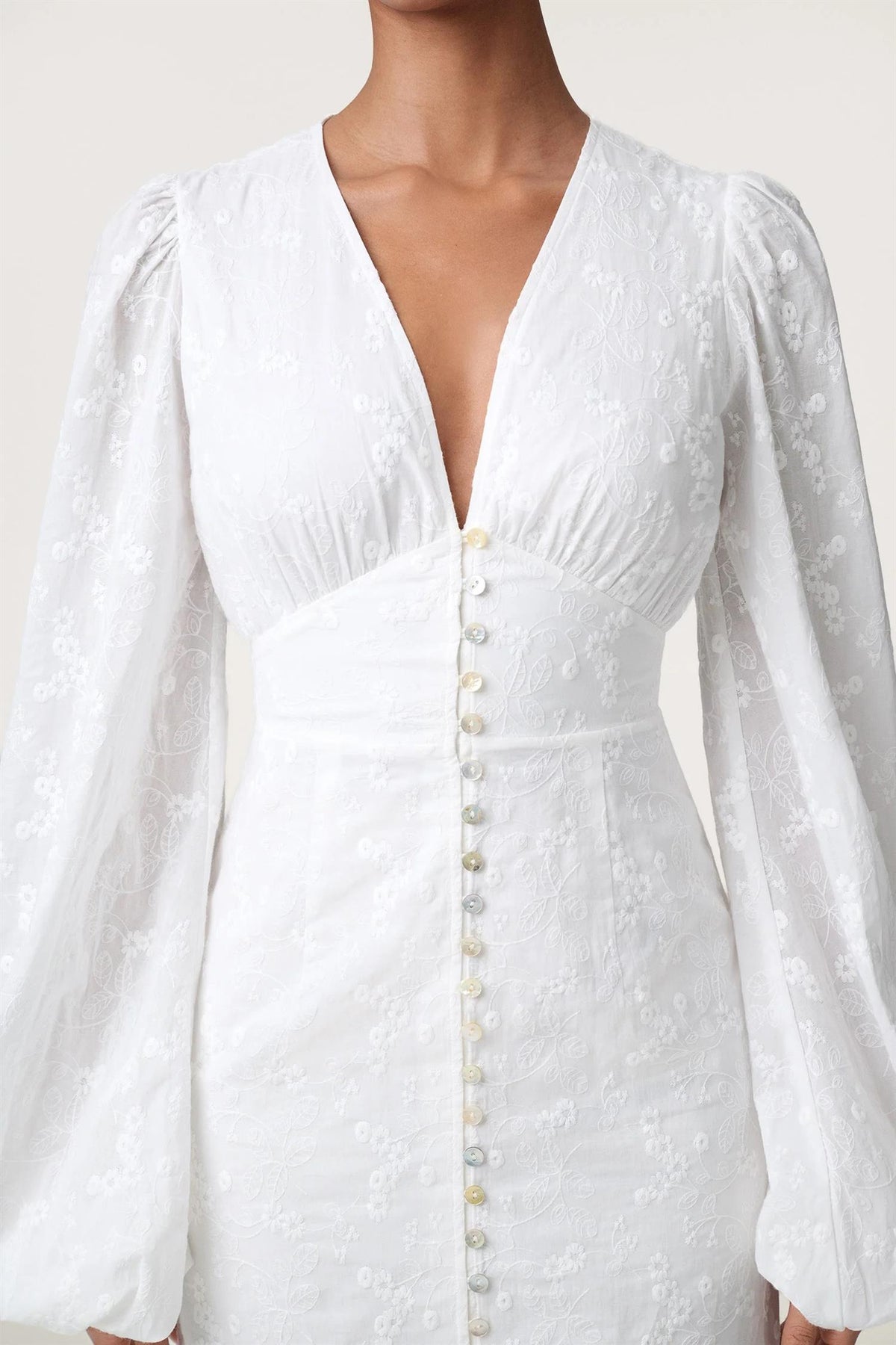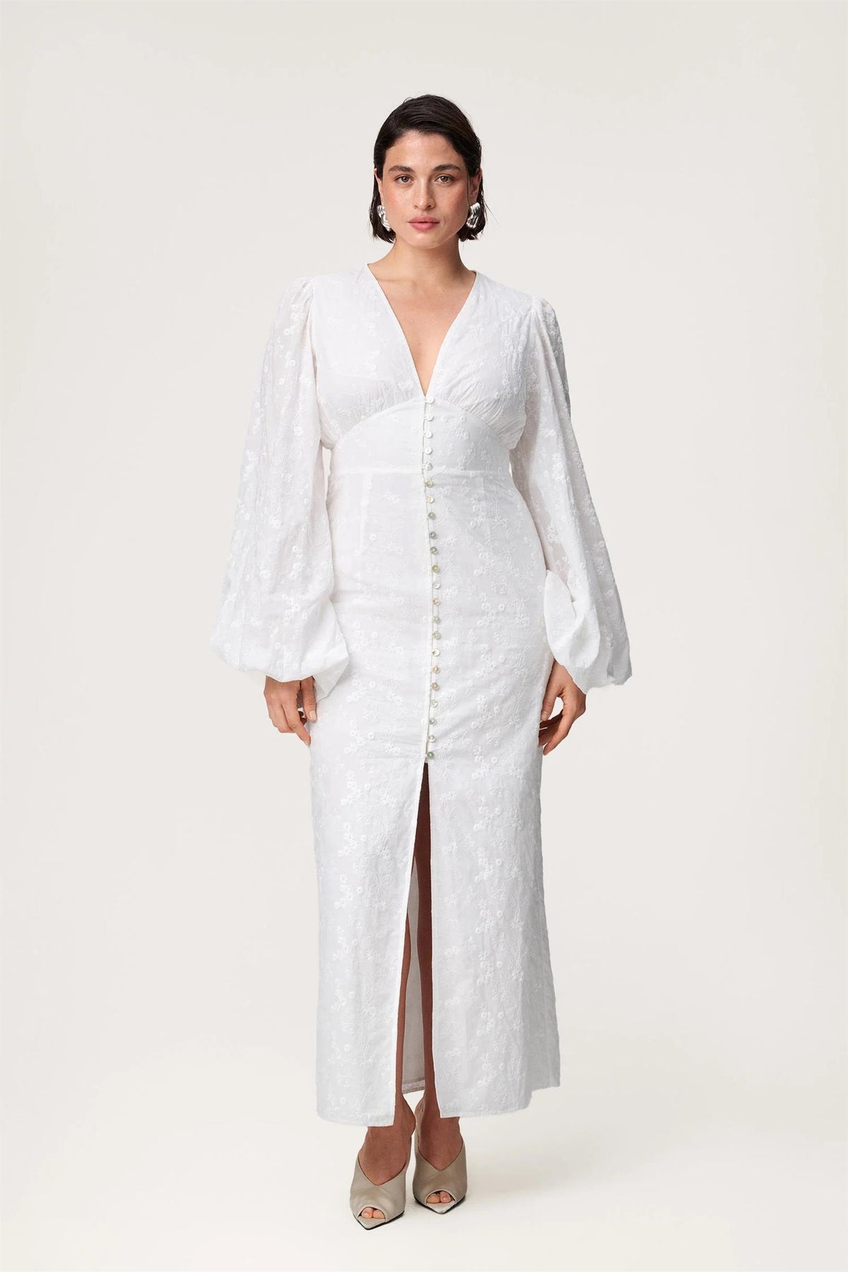 Positano Maxi Dress fra Adoore er en elegant og sofistikert maxikjole i vakker hvit broderie anglaise. Kjolen har en flatterende V-utringning, dekorative knapper i front og en feminin frontslisse nederst som gir både bevegelse og et raffinert uttrykk. De lange ermene balanserer silhuetten og tilfører et klassisk preg. Kjolen er helfôret for optimal komfort og har skjult glidelås bak. Årets modell er oppdatert med fire elastiske knappeløkker nederst, som gir en mer komfortabel og slitesterk passform.