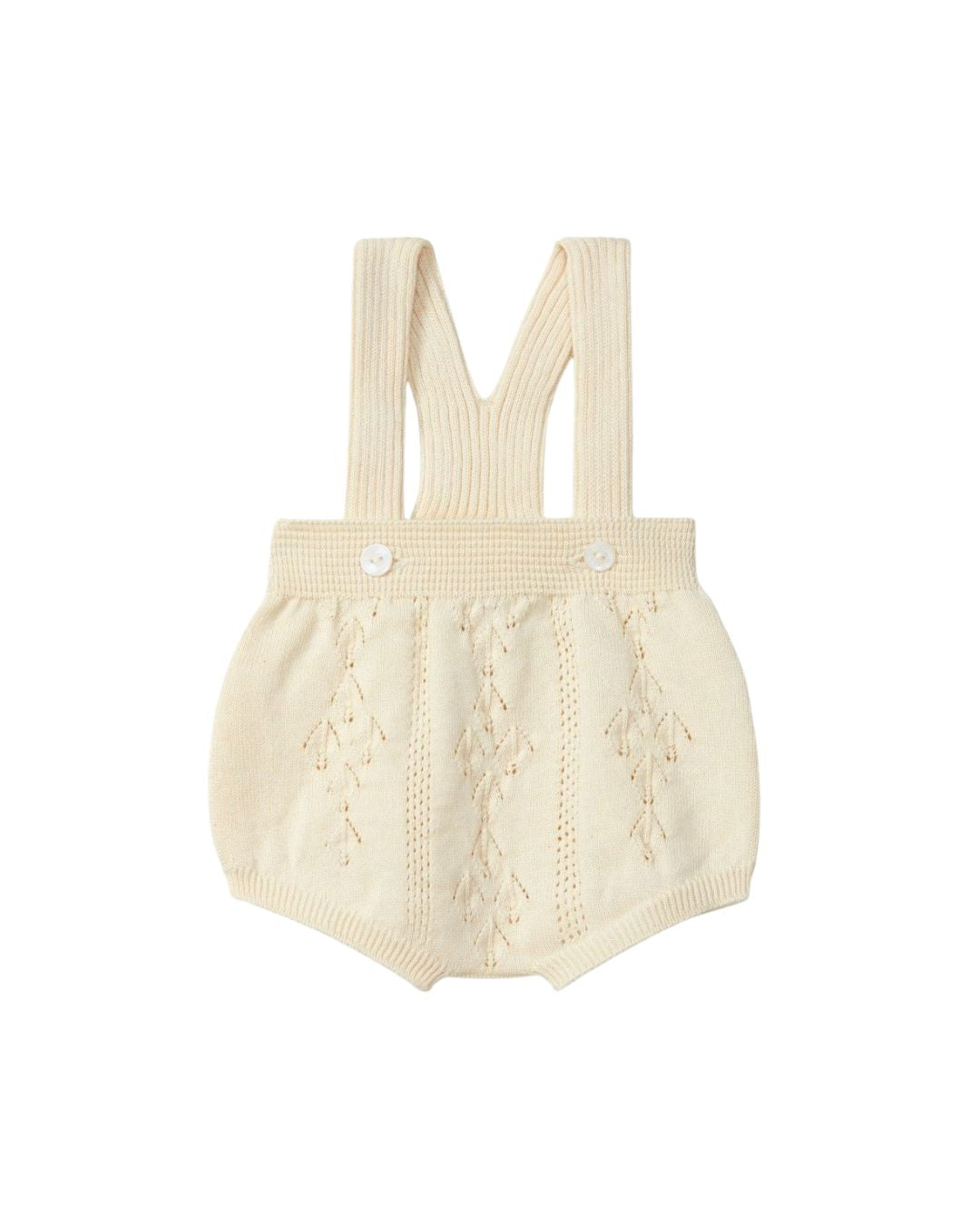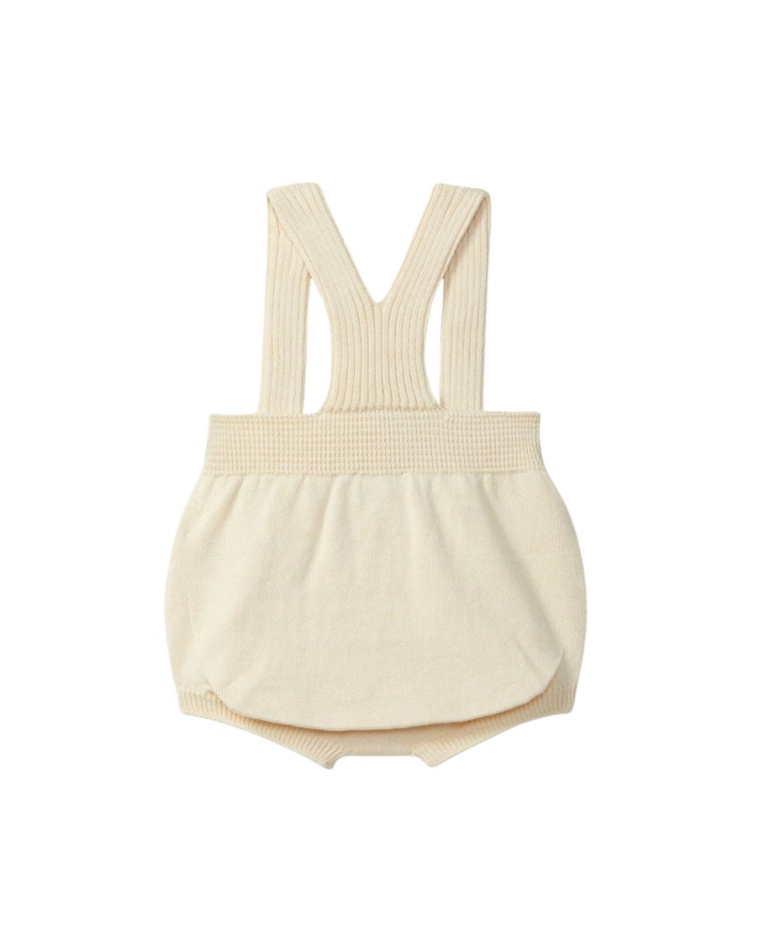 Wedoble Shoulder Straps Shortie Knitted er en myk og komfortabel romper til baby, strikket i en lett og pustende kvalitet som føles behagelig mot sensitiv hud. Den delikate strikkestrukturen gir et tidløst uttrykk og gjør plagget perfekt til både hverdagsbruk og små anledninger.