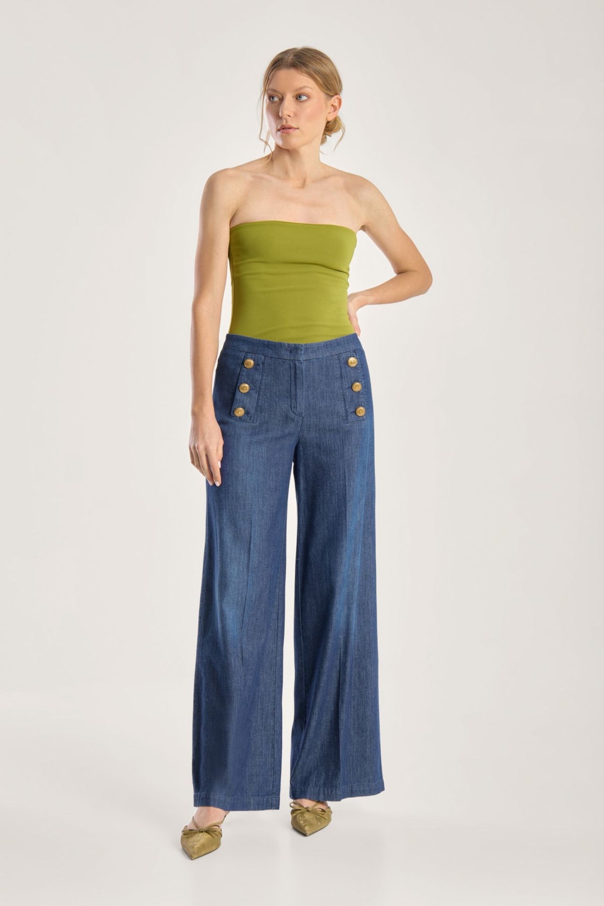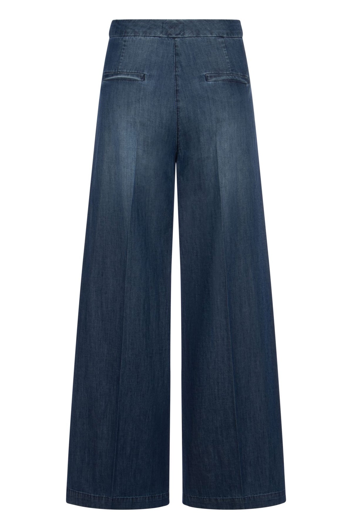 Brigdet Summer Denim fra Seductive er en elegant bukse med vide ben og et sofistikert uttrykk – perfekt for en moderne sommergarderobe. Den kombinerer klassisk skreddersøm med en avslappet denimfølelse. Buksen har en flatterende mid-waist og vide ben som gir en flytende og stilren silhuett. Fronten er detaljert med knappelukking og pressfolder som tilfører et raffinert preg, mens stikklommer bak gir en klassisk finish. En allsidig bukse som enkelt kan styles med skjorter, topper eller strikk for en gjennomført look.