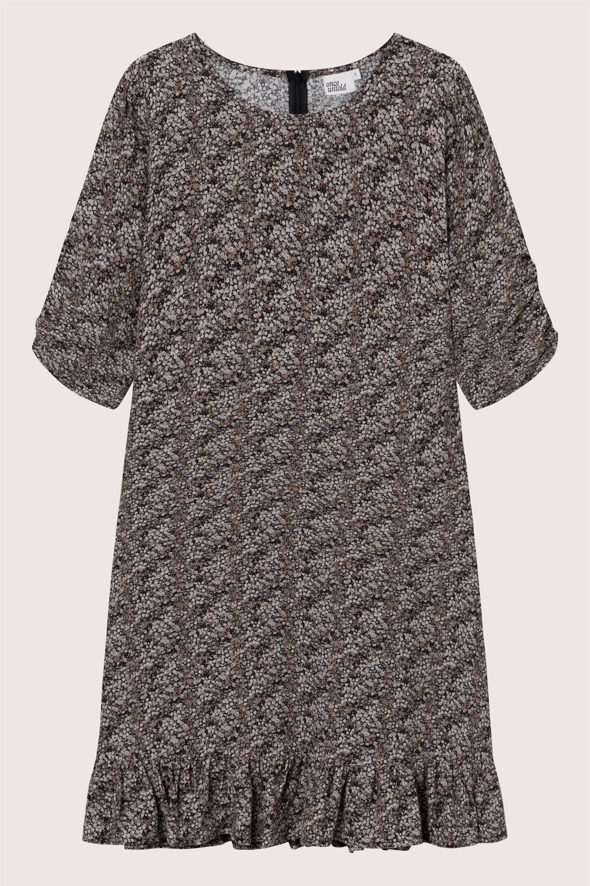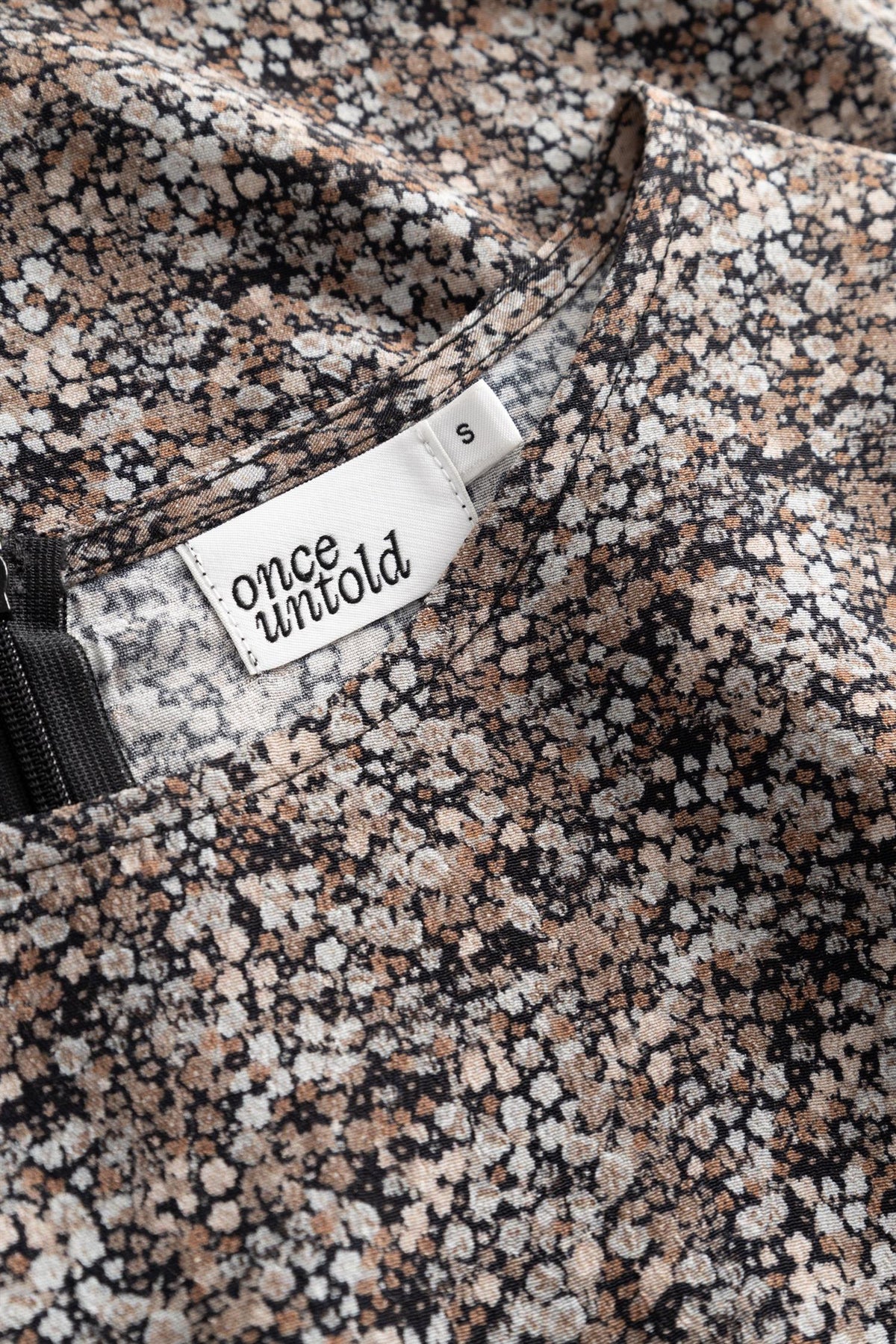 Ellen Dress fra Once Untold. Ellen-kjolen er en knelang kjole med et vakkert blomstermønster med små blomster. Kjolen har volangkant, korte avsmalnende ermer og avrundet hals. Bak på kjolen er det glidelås. Perfekt å style med et par støvler og strømpebukser.